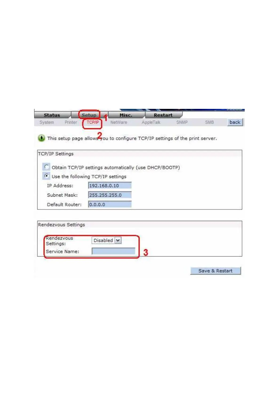 1. Enable the Rendezvous settings from the print server’s WEB configuration.