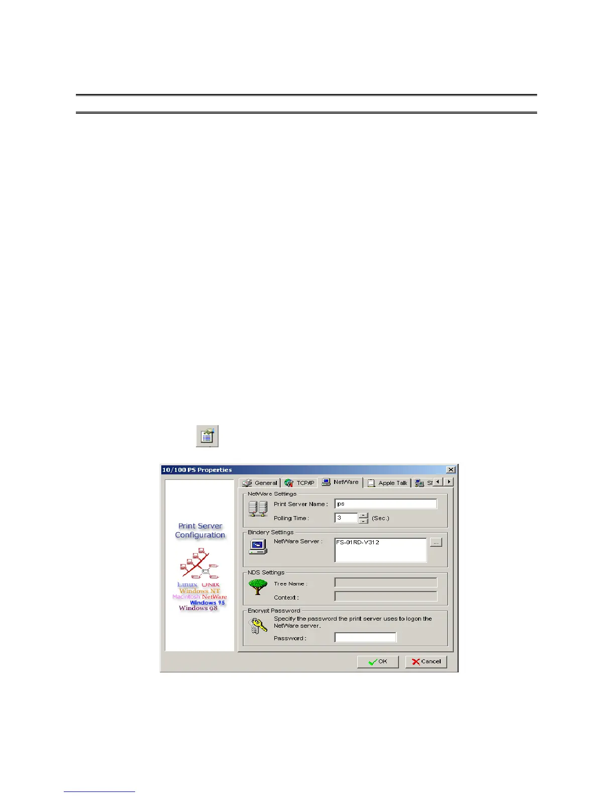 5. Select NetWare and type in the Print server that created during PCONSOLE.