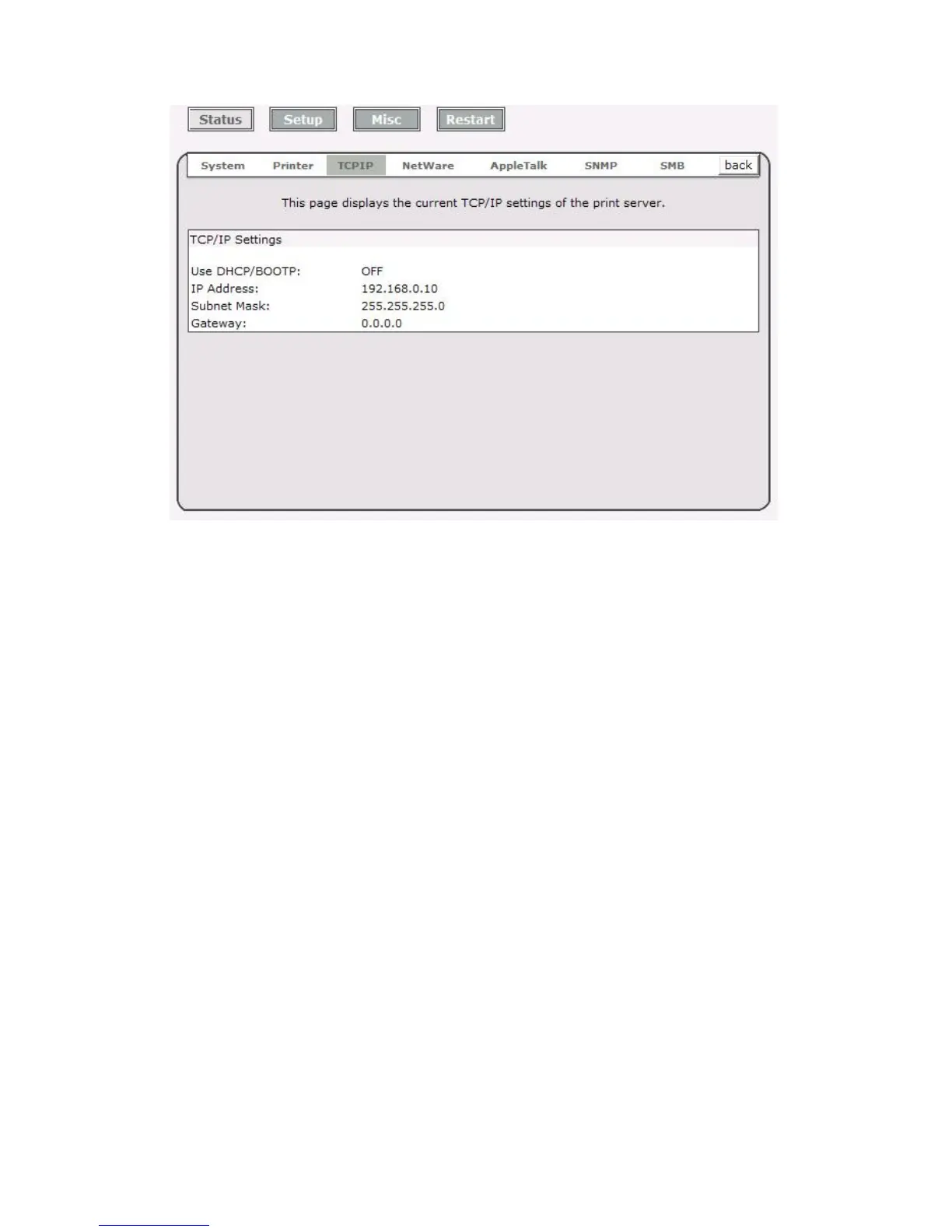 IP Address: This option allows you to view IP address from the print server. The IP address
