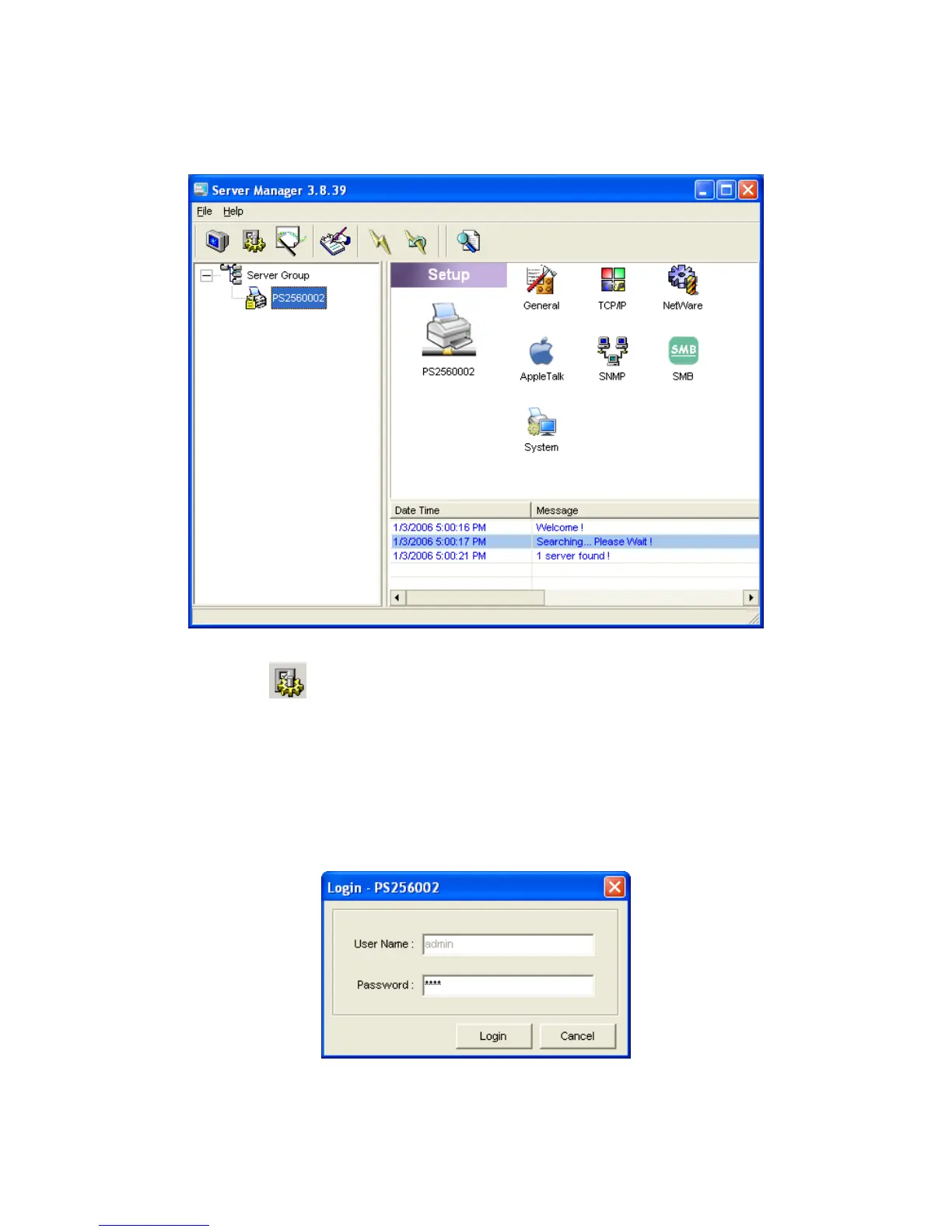 Double click one of the icons to set up the selected printer server. A screen will pop up to verify
