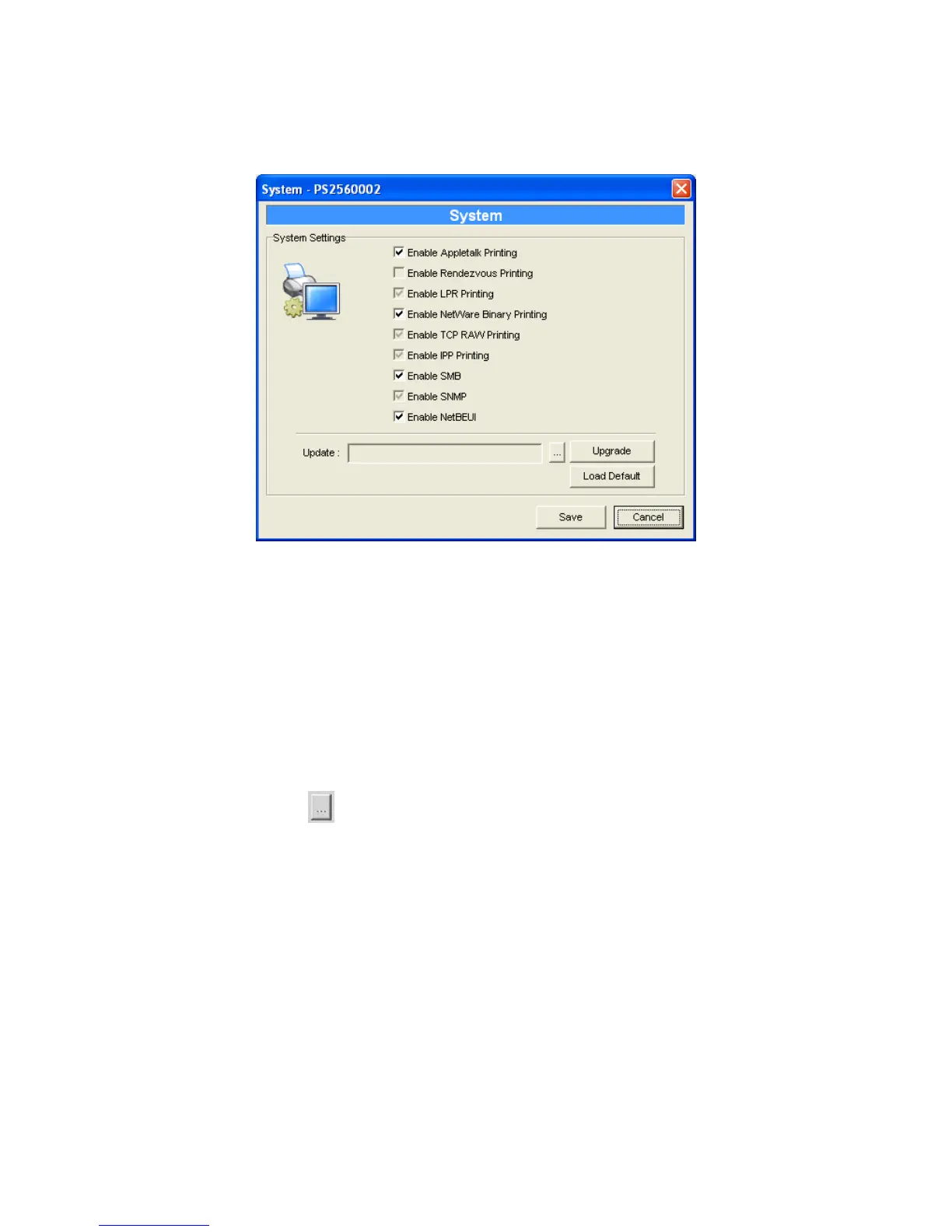 protocol, upgrade the new firmware for this printer server, and load factory defaults to the printer