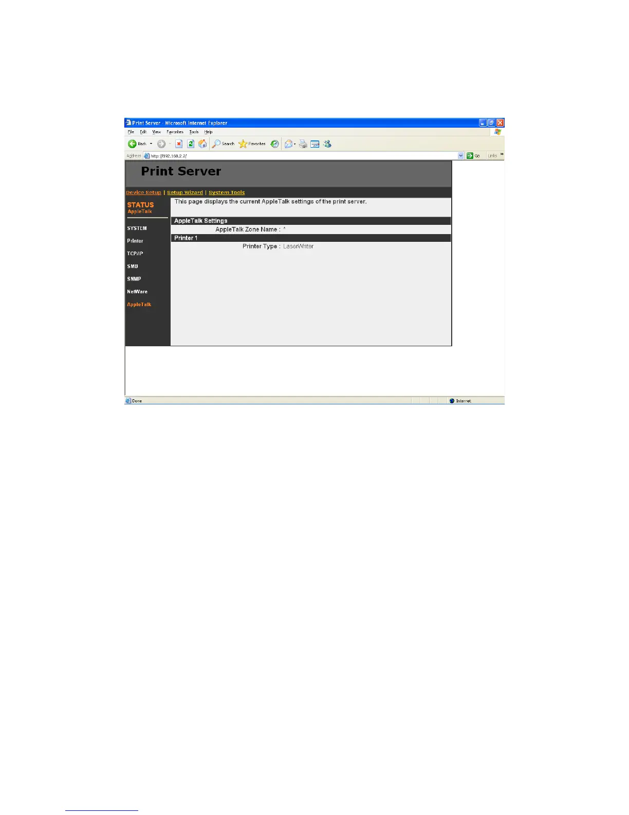 This page lists AppleTalk settings, including “AppleTalk Zone Name” and “Printer Type” of the