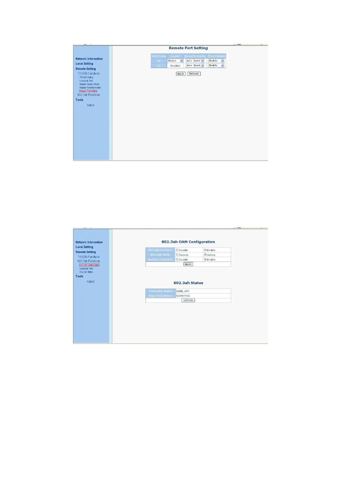 This page could set 803.ah OAM function. User could enable/disable 802.3ah function and set its mode as passive