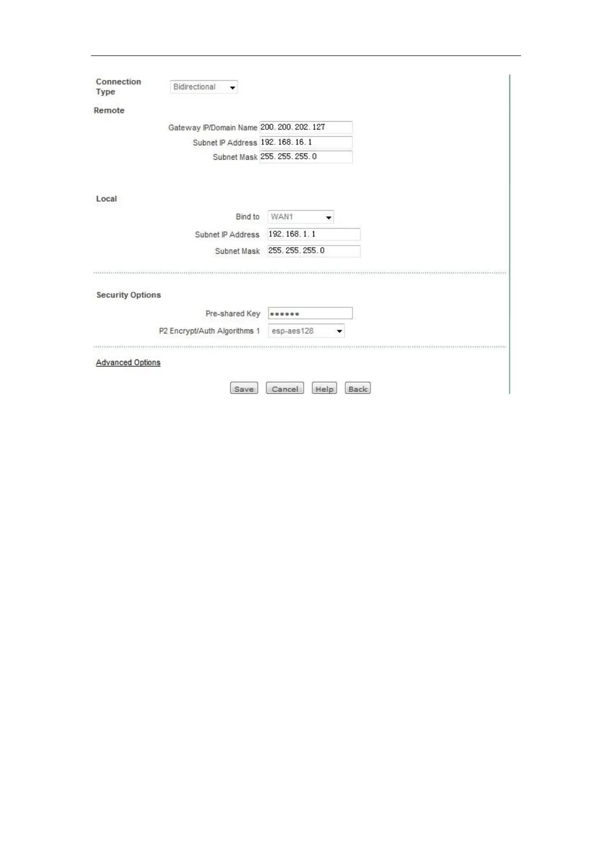 bound at WAN1 port. Set the preshared key for the first phase to testing, and the encryption and