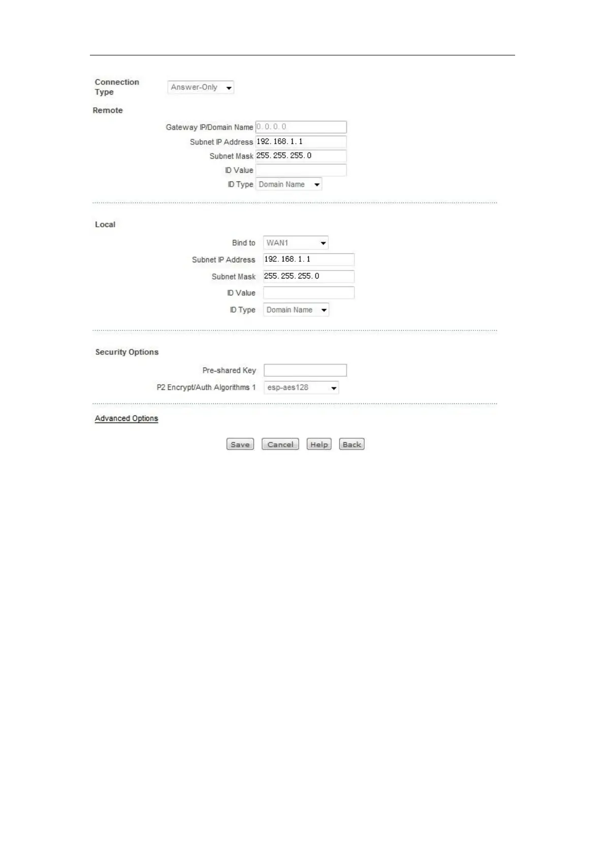 ID. Locally bound at the WAN1 port, set the preshared key for the first phase to testing, and the