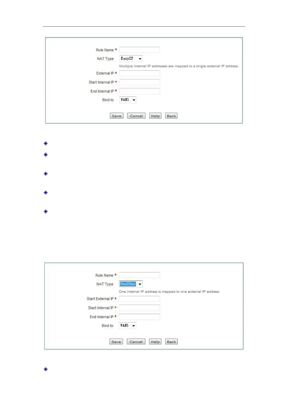 NAT type: Selects EasyIP here, which means the internal IP address are mapped to the same