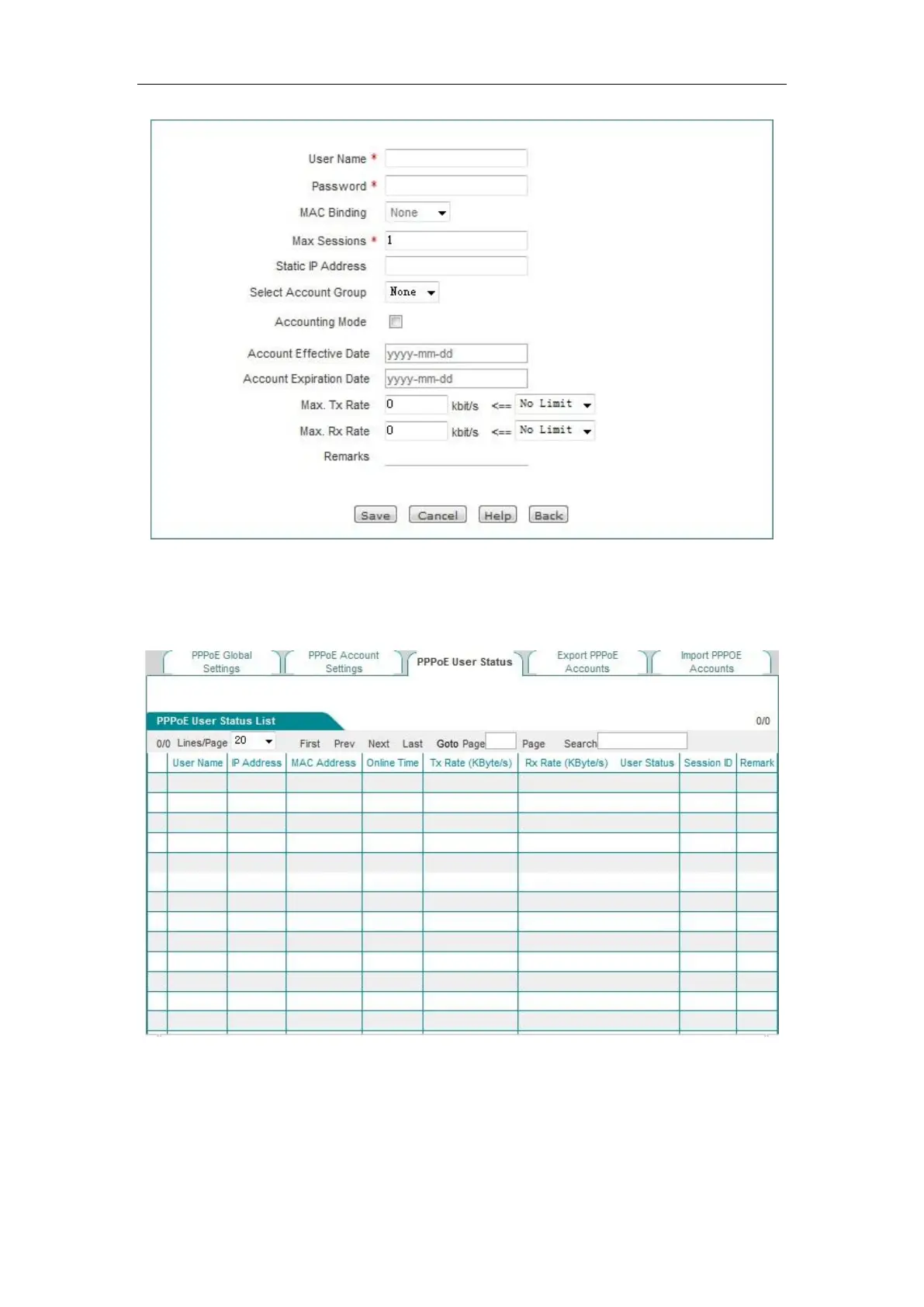 3) Repeat Step 2, and configure the account with the PPPoE user name as test2. Bind it with