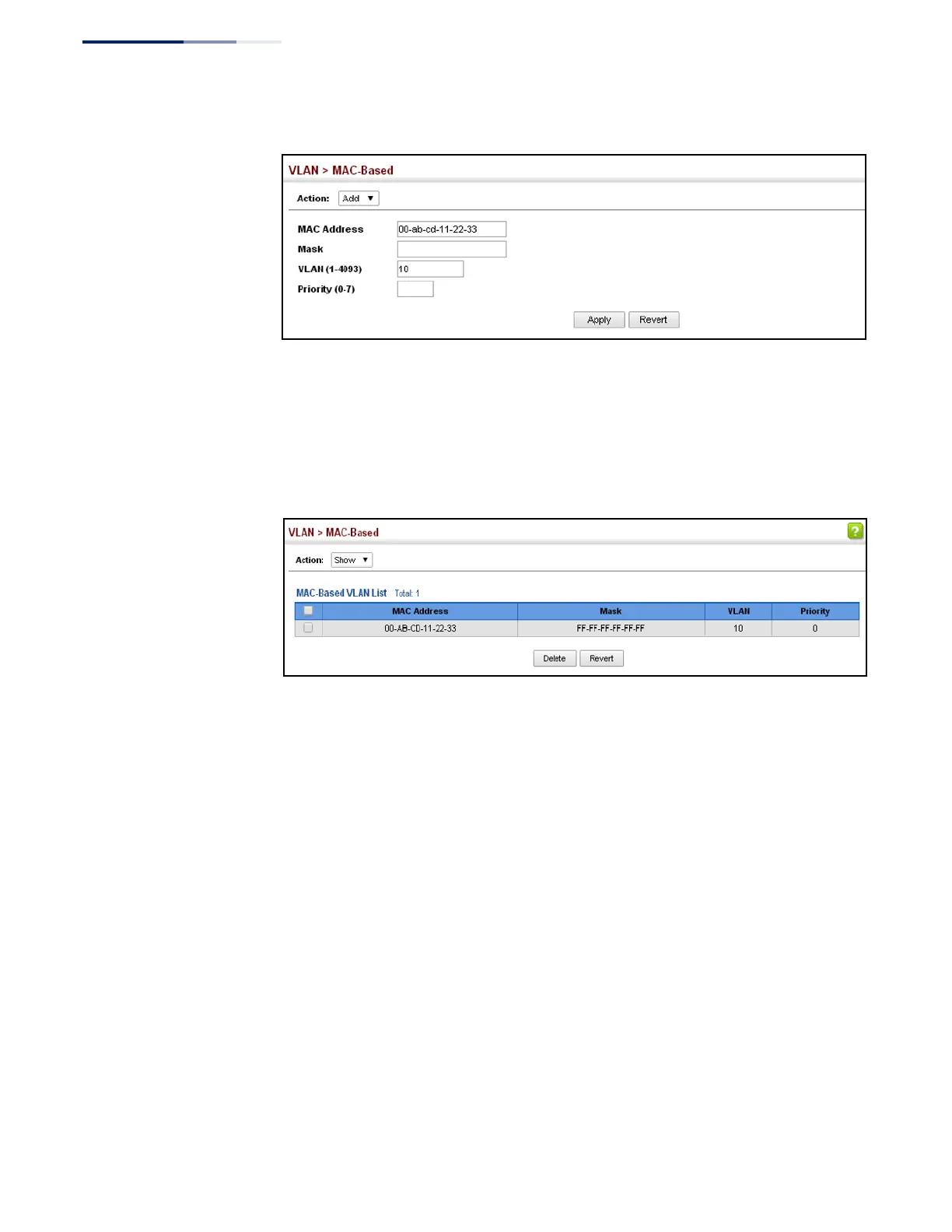 LevelOne GEL-1061 - Figure 82: Configuring MAC-Based Vlans; Figure 83: Showing MAC-Based Vlans