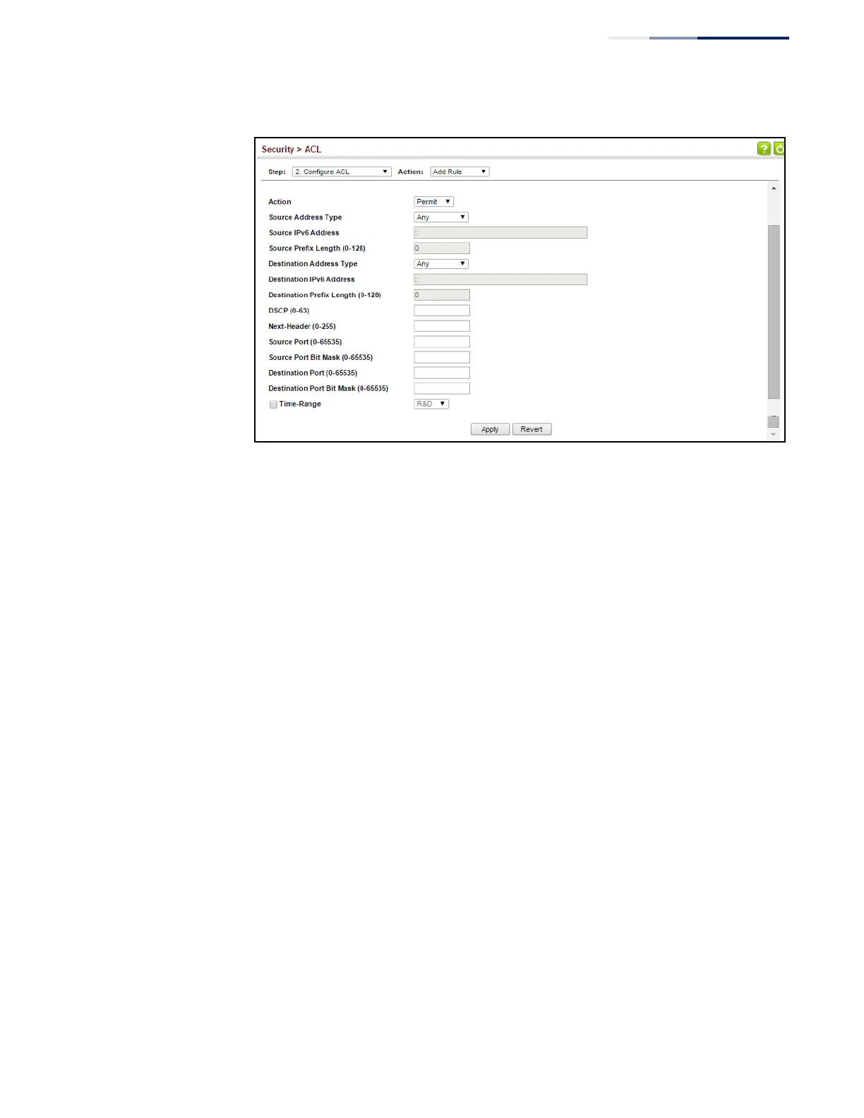 Use the Security > ACL (Configure ACL - Add Rule - MAC) page to configure a MAC