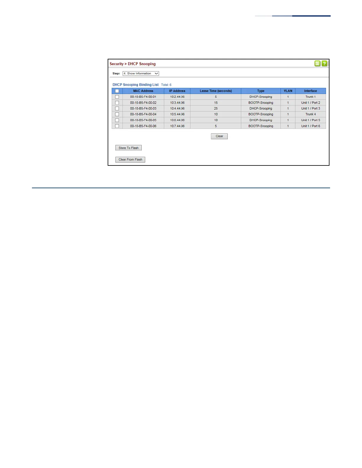 Figure 194: Displaying the Binding Table for DHCP Snooping