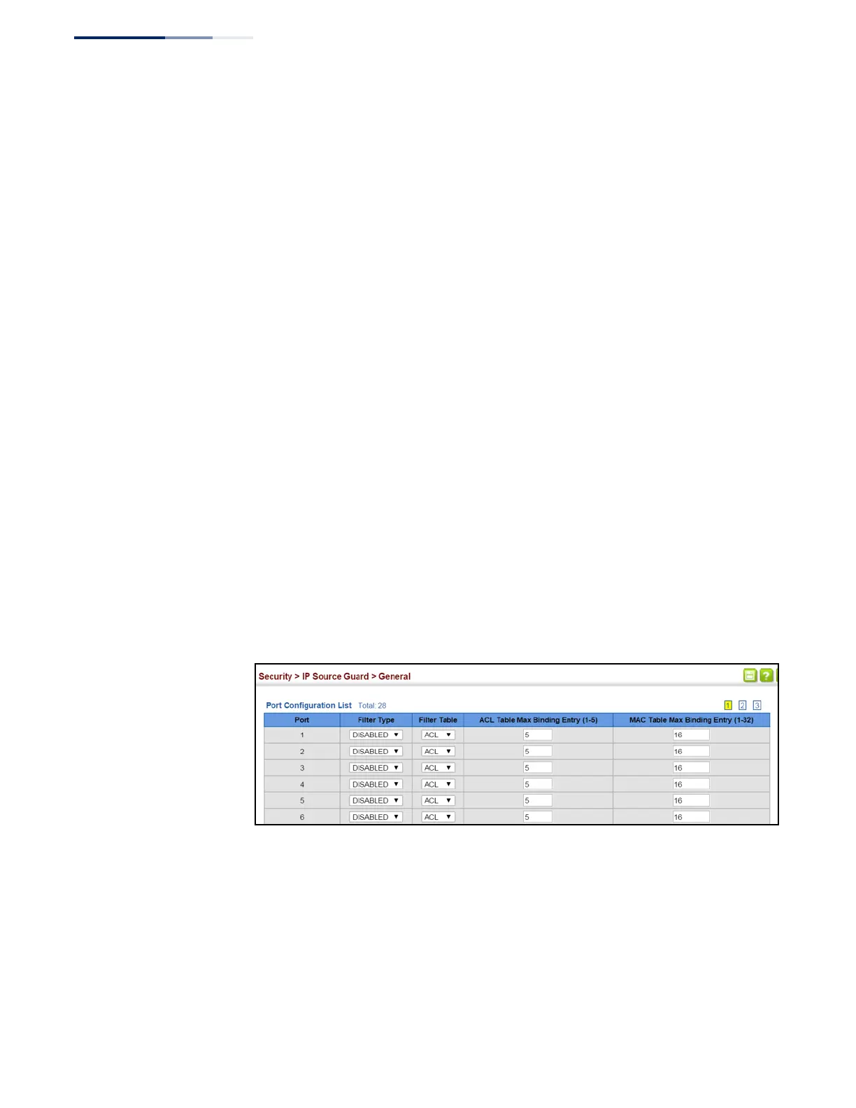 To set the IP Source Guard filter for ports: