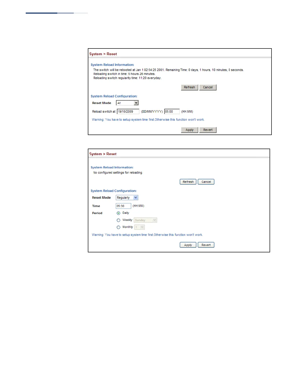 LevelOne GEL-1061 - Figure 30: Restarting the Switch (At); Figure 31: Restarting the Switch (Regularly)