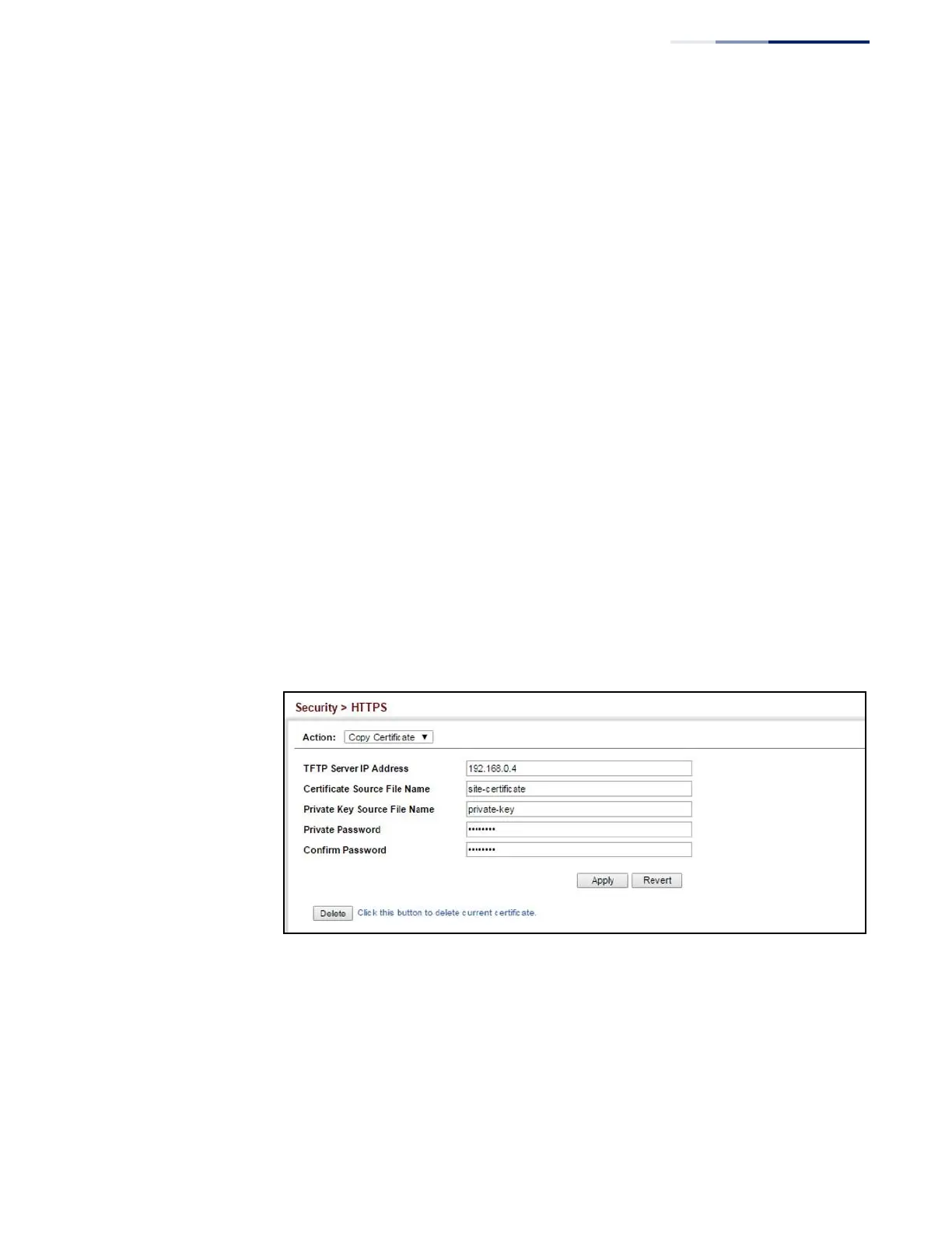 Deletes the HTTPS secure site certificate. You must reboot the switch
