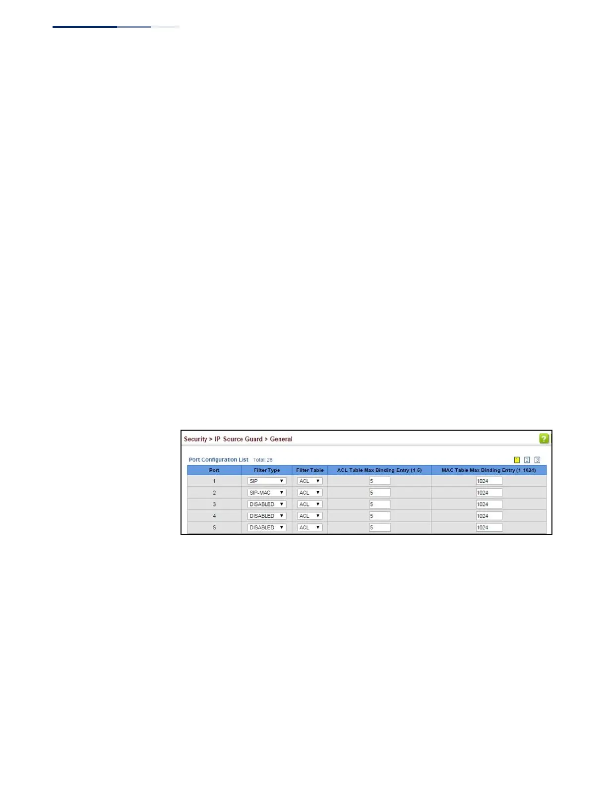 To set the IP Source Guard filter for ports: