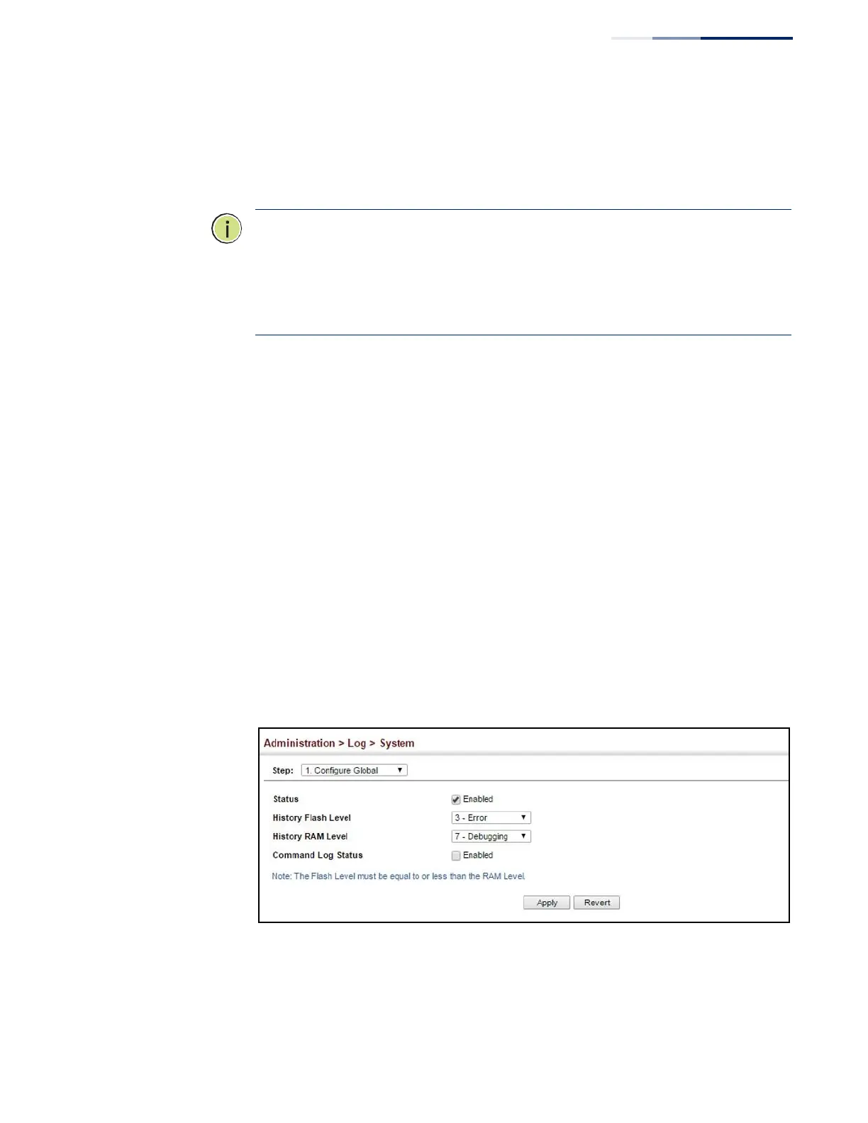 RAM Level – Limits log messages saved to the switch’s temporary RAM