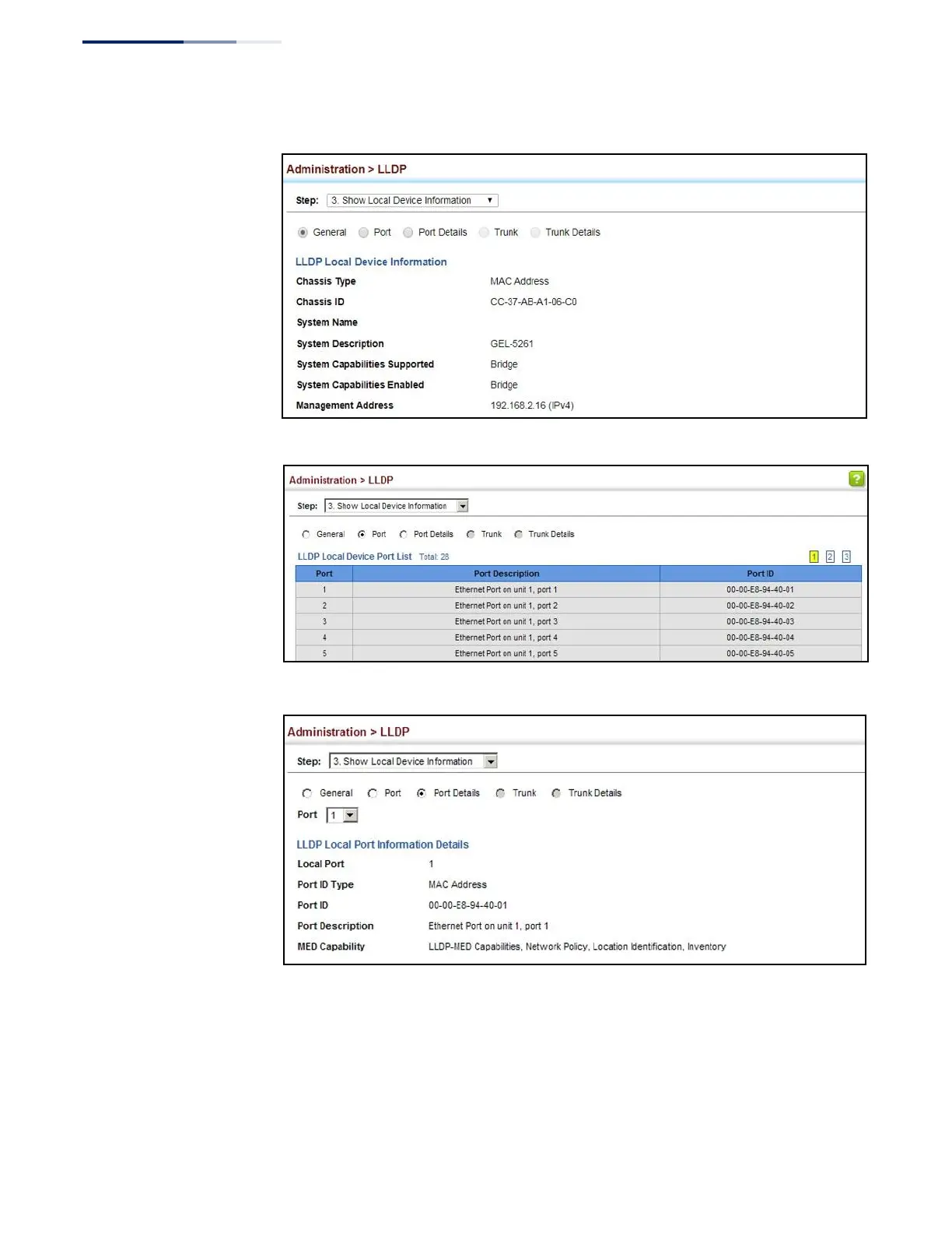 LevelOne GEL-5261 - Figure 216: Displaying Local Device Information for LLDP (General); Figure 217: Displaying Local Device Information for LLDP (Port); Figure 218: Displaying Local Device Information for LLDP (Port Details)