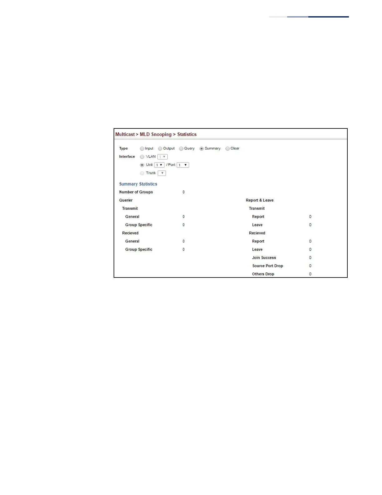 LevelOne GEL-5261 - Figure 311: Displaying MLD Snooping Statistics - Summary (Port;Trunk)