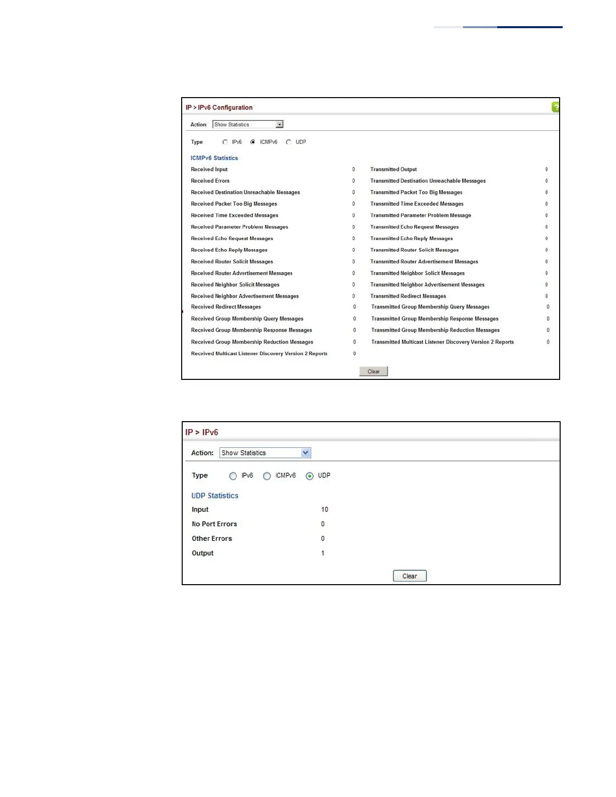 LevelOne GEL-5261 - Figure 338: Showing Ipv6 Statistics (Icmpv6); Figure 339: Showing Ipv6 Statistics (UDP)