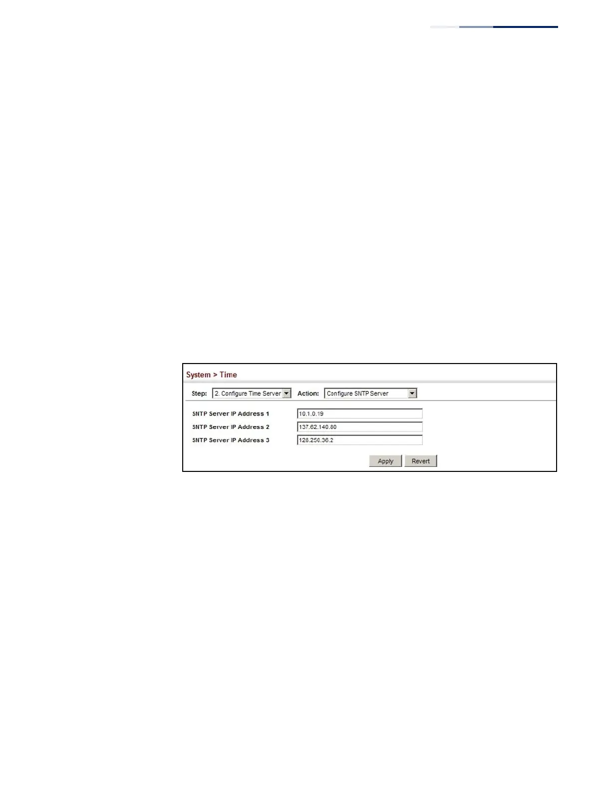 NTP Server IP Address – Sets the IPv4 address for up to three time servers. The