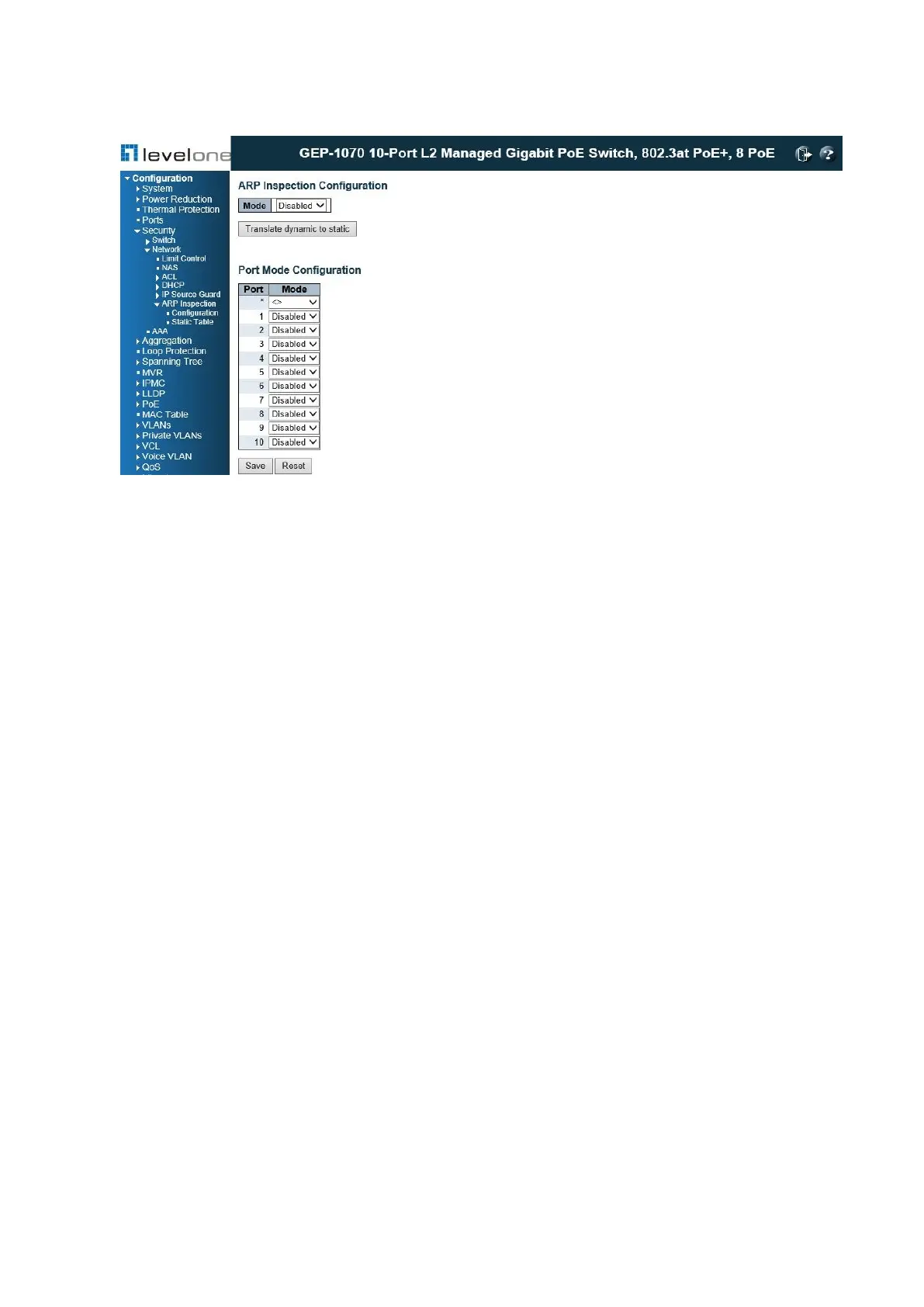 ◆ Mode – Enables Dynamic ARP Inspection globally. (Default: Disabled)