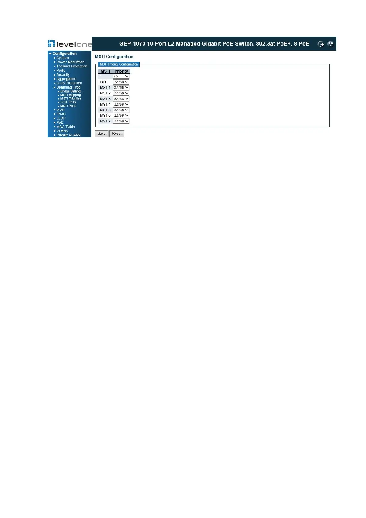 1. Click Configuration, Spanning Tree, MSTI Priorities.
