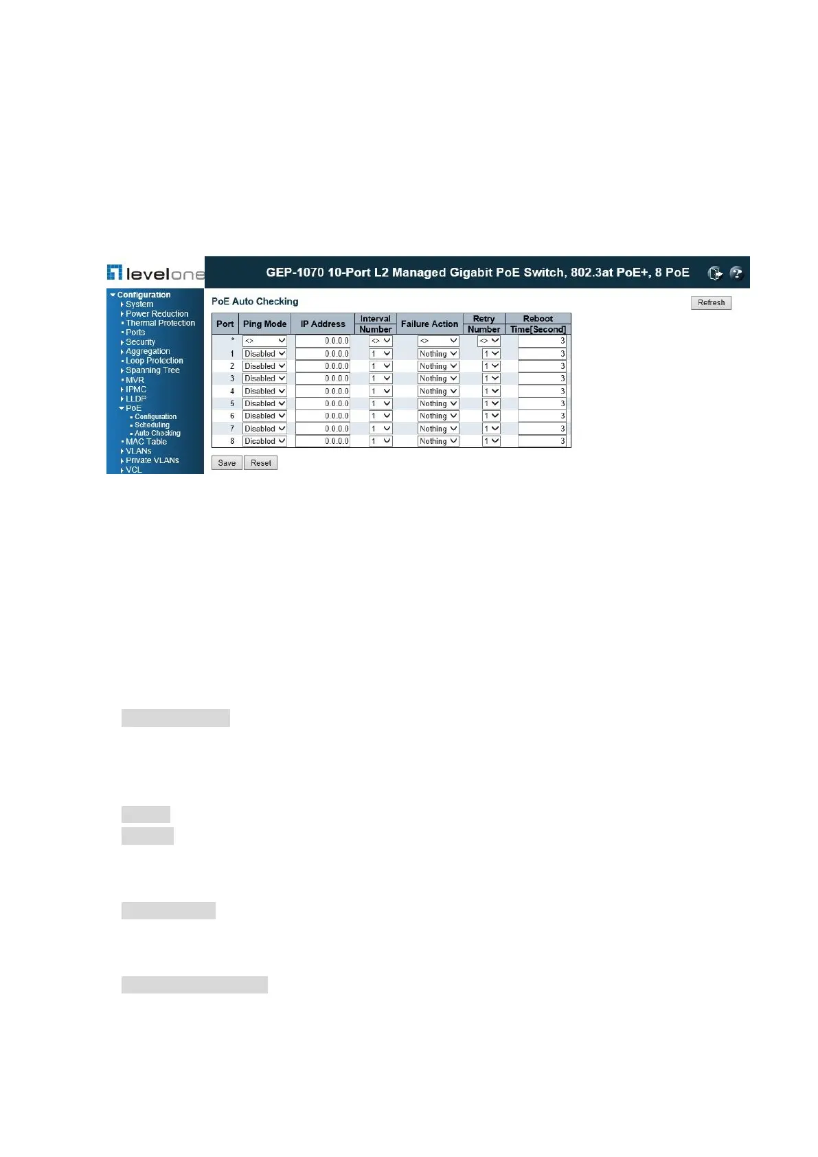 ◆ Ping Mode – This is to enable / disable the PoE autochecking for the selected port.
