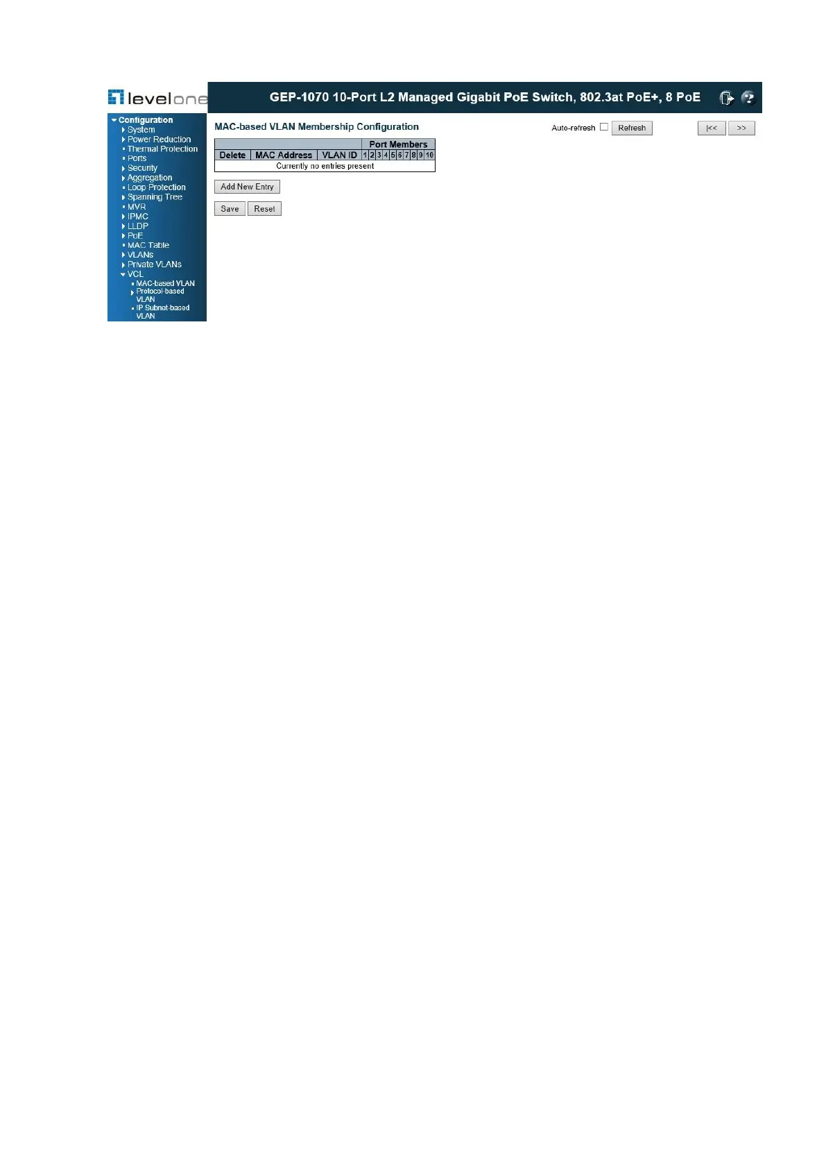 1. Click Configuration, VCL, MAC-based VLANs.