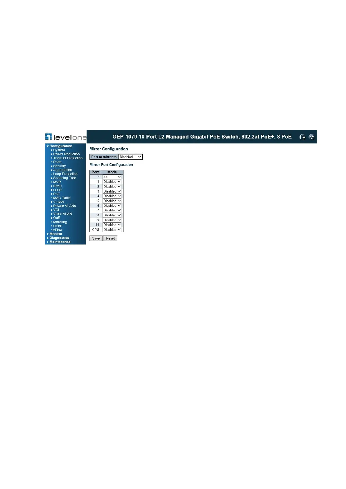 Use the Mirror Configuration page to mirror traffic from any source port to a target port for