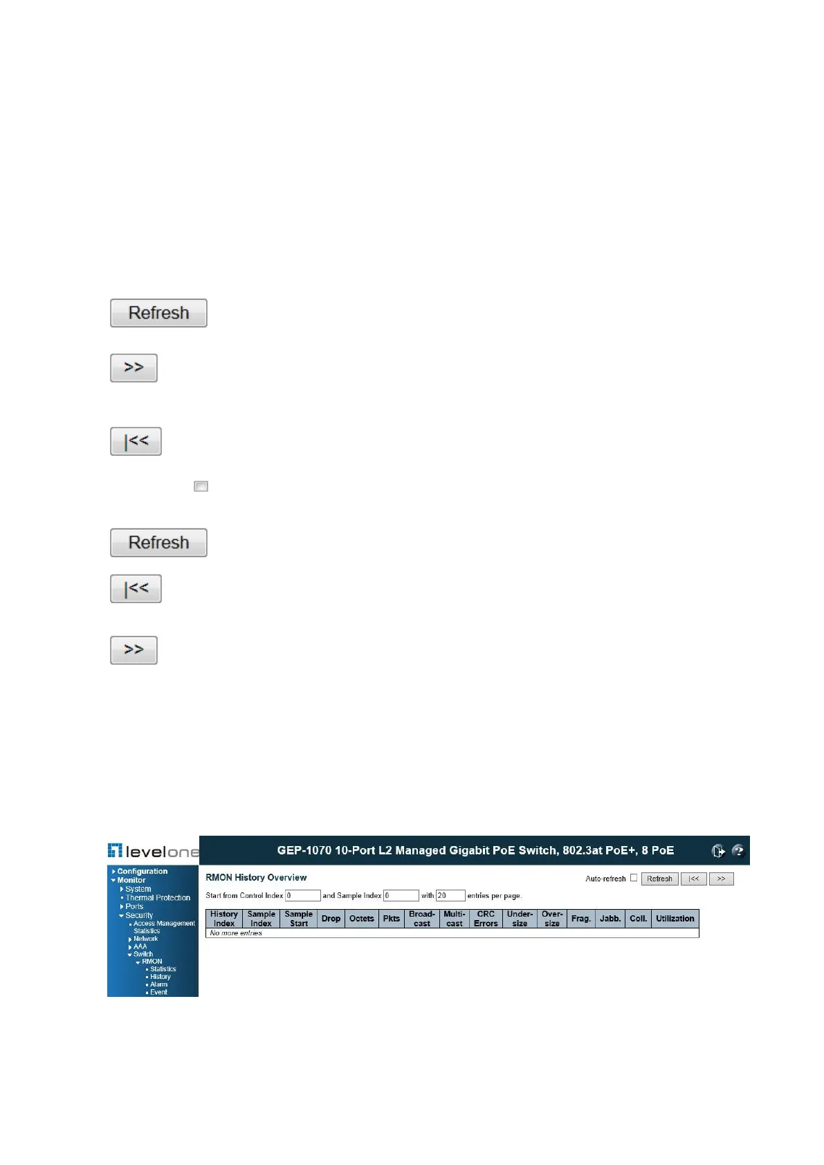 This page provides an overview of RMON History entries. Each page shows up to 99 entries