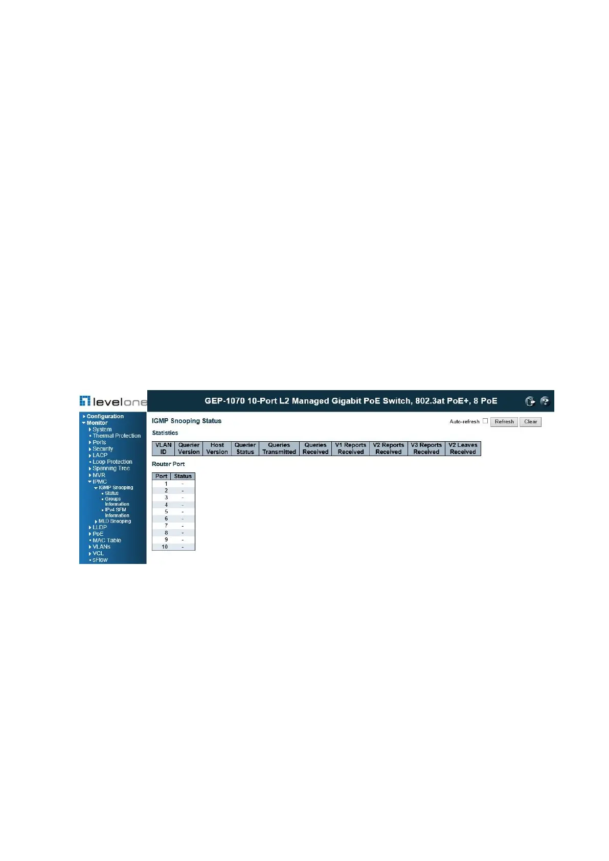 Use the IGMP Snooping pages to display IGMP snooping statistics, port members of each