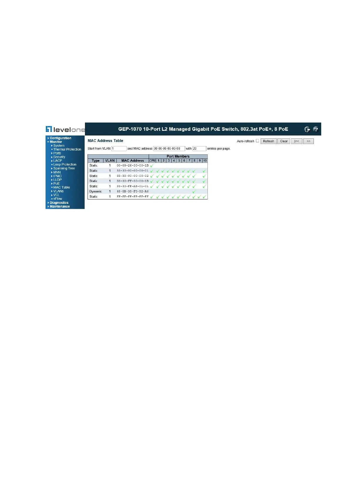 Use the MAC Address Table to display dynamic and static address entries associated with