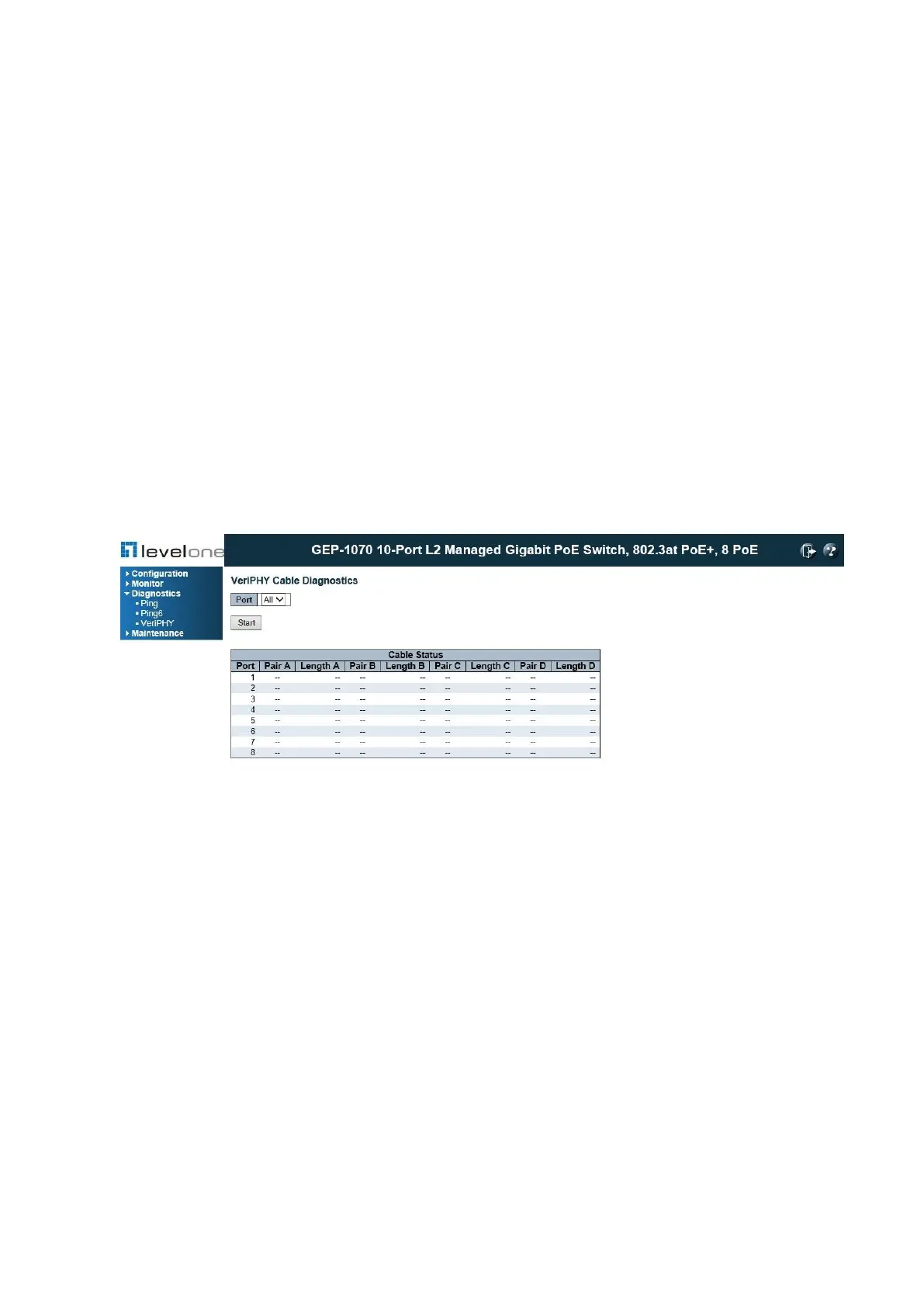 The VeriPHY page is used to perform cable diagnostics for all ports or selected ports to