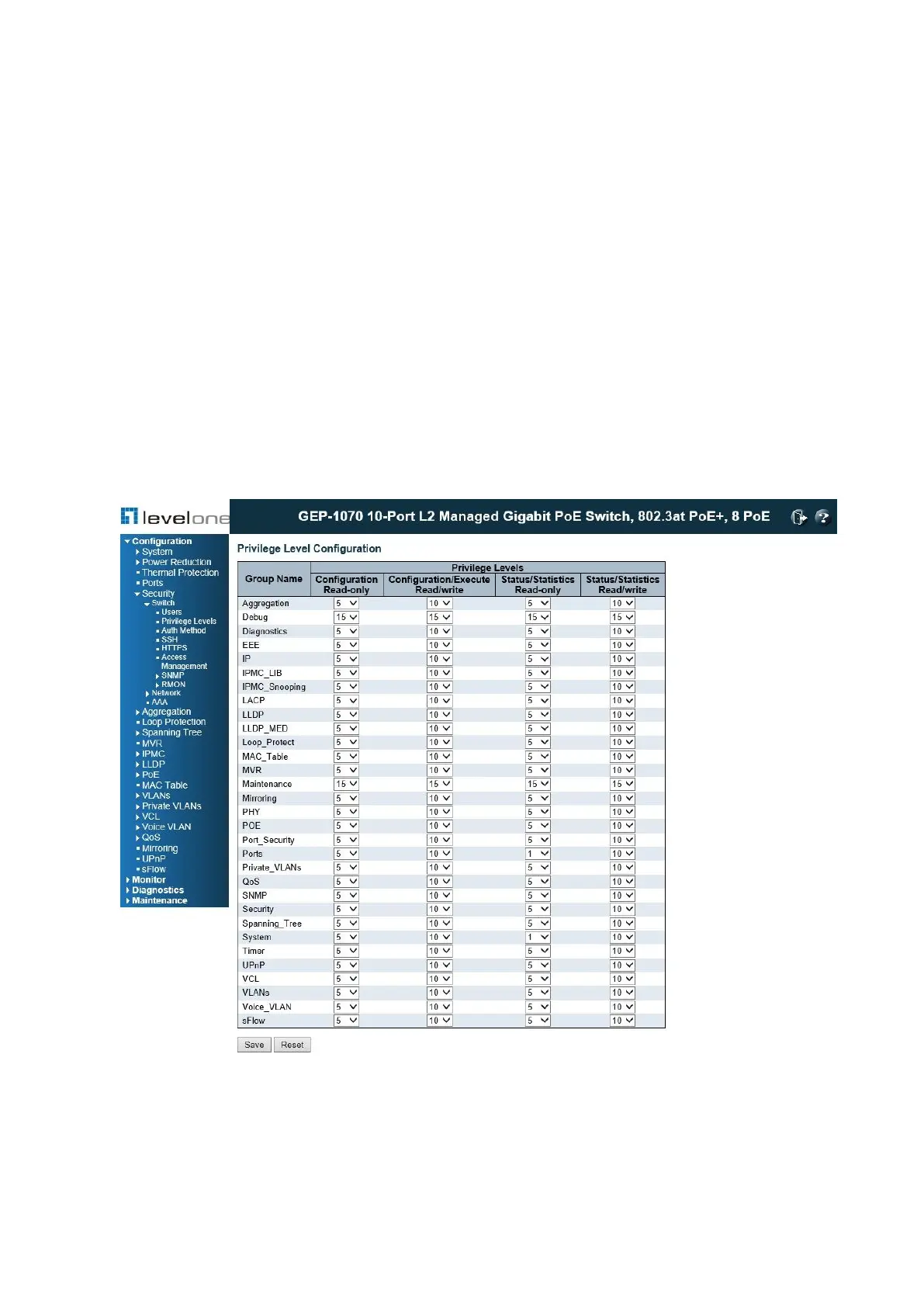 Configuration \ Security \ Switch \ Privilege Levels