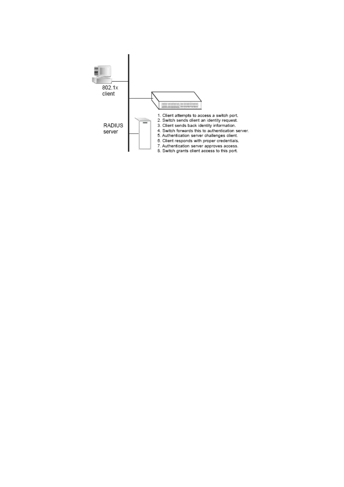 The operation of 802.1X on the switch requires the following: