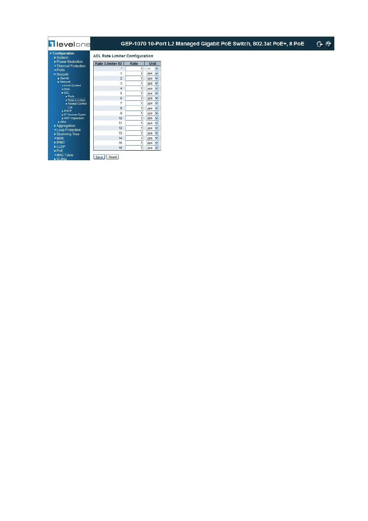 ◆ Rate Limiter ID - Rate limiter identifier. (Range: 0-14; Default: 1)