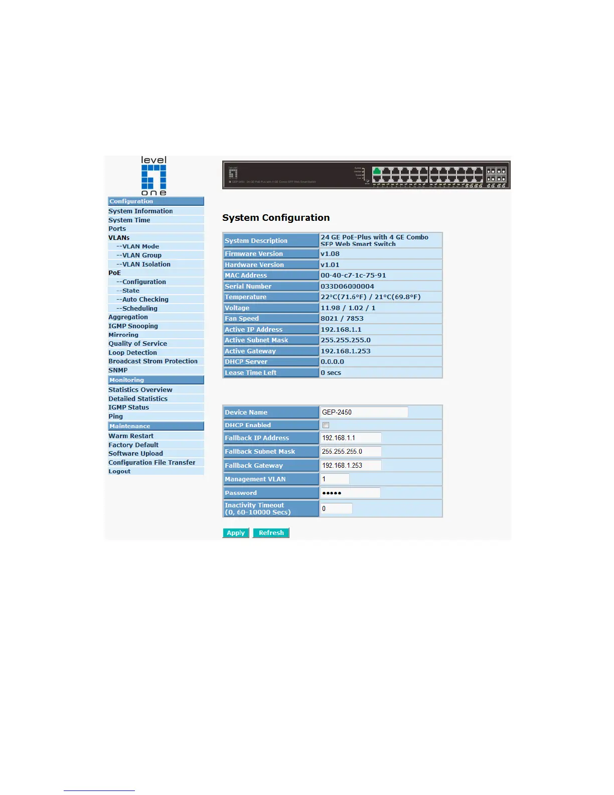 On the top part of the information page, it shows the front panel of the switch.