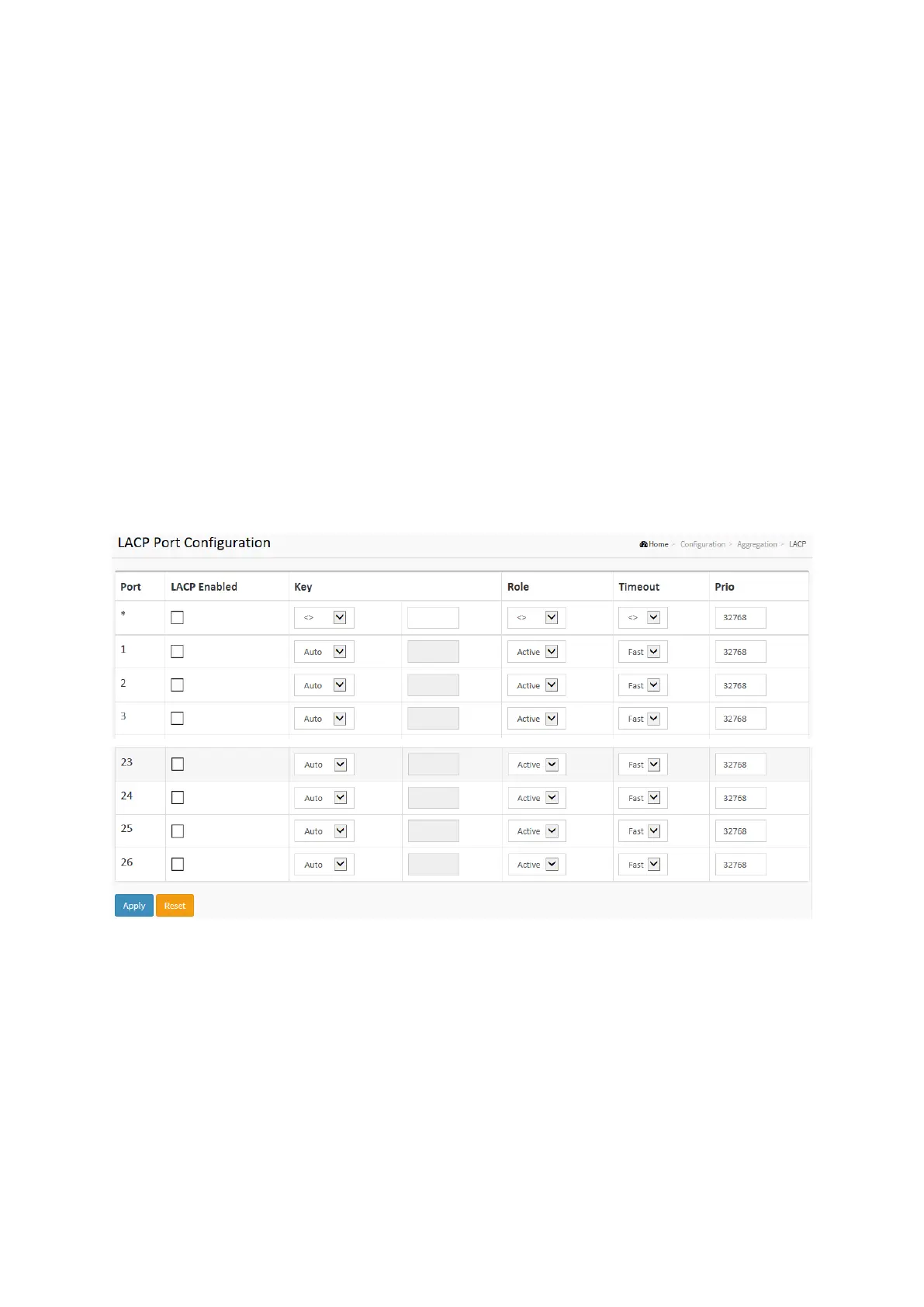 1. Click Configuration, LACP, Configuration