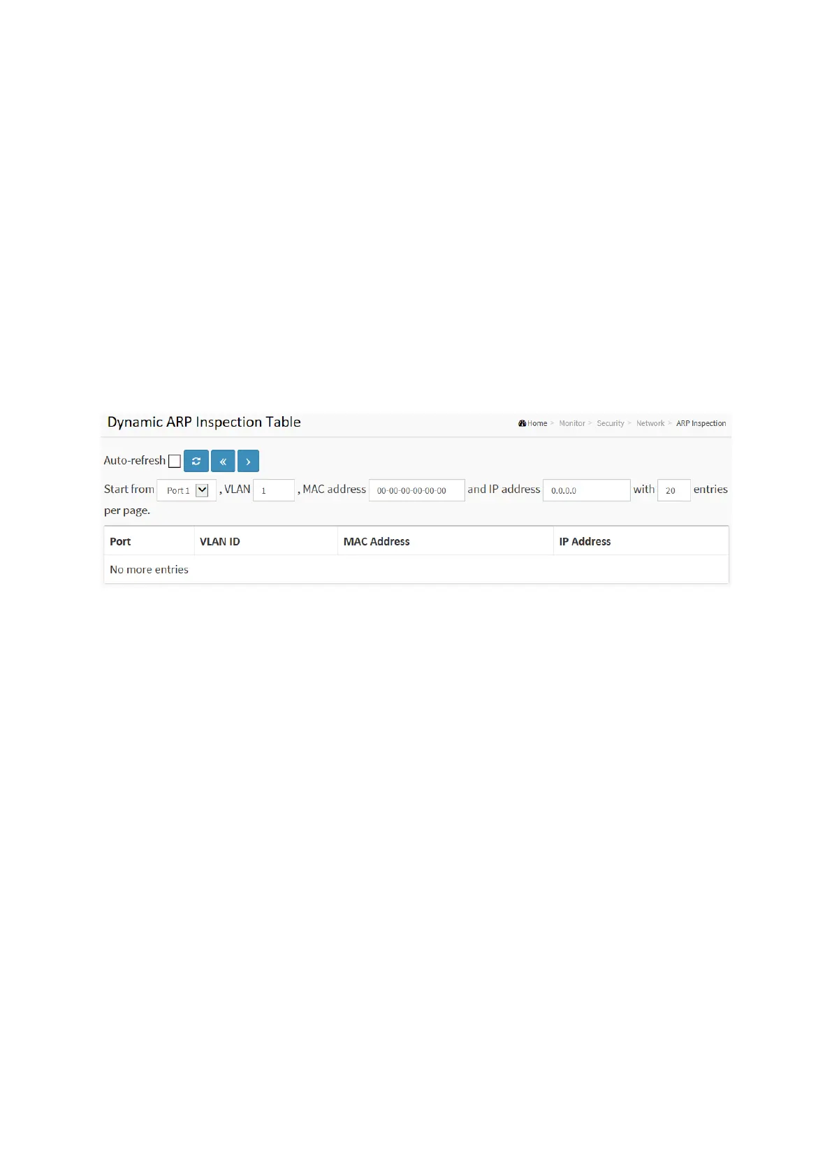 Each page shows up to 99 entries from the Dynamic ARP Inspection table, default being 20, selected