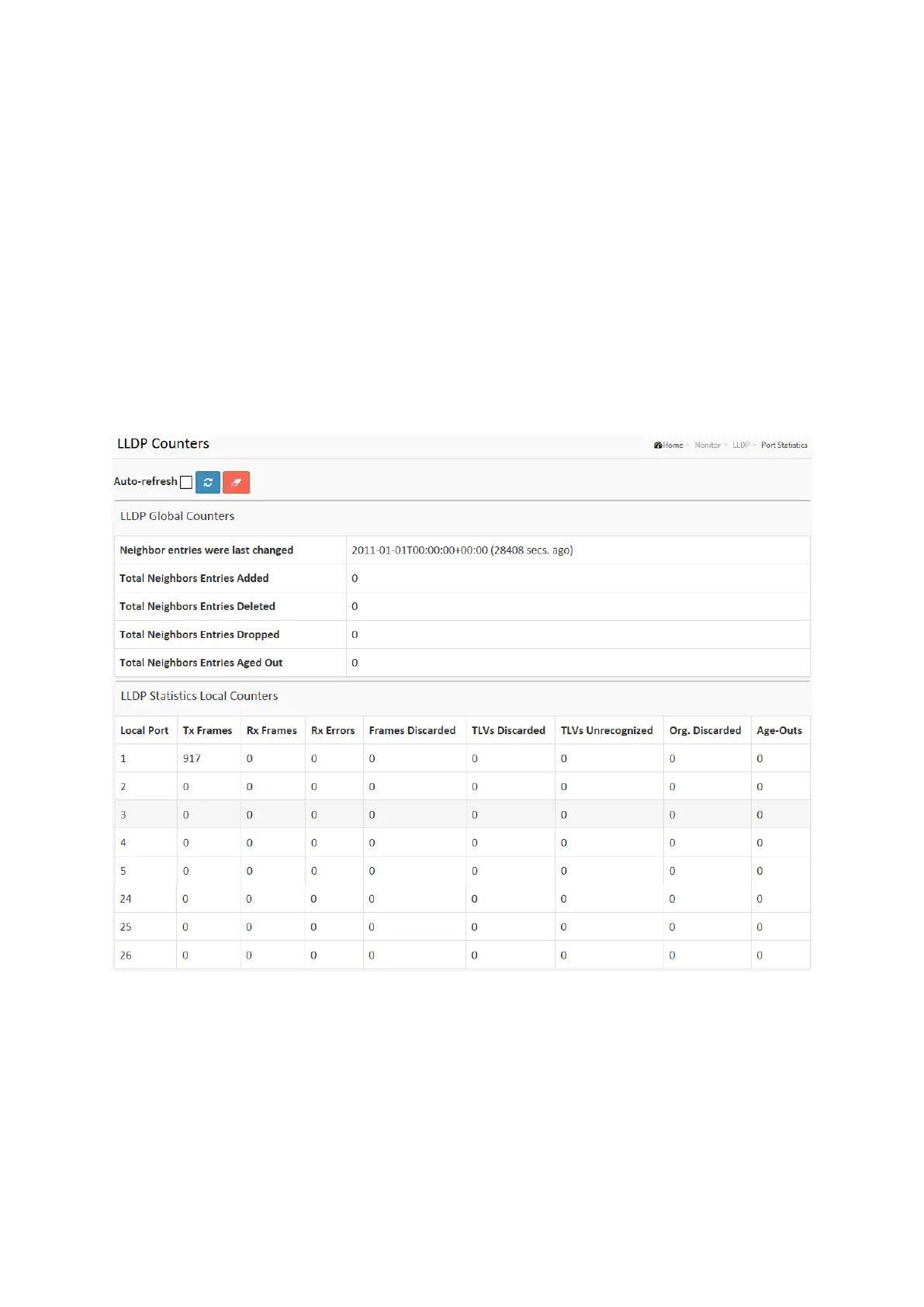 1. Click Monitor ,LLDP, then click Port Statistics to show LLDP counters