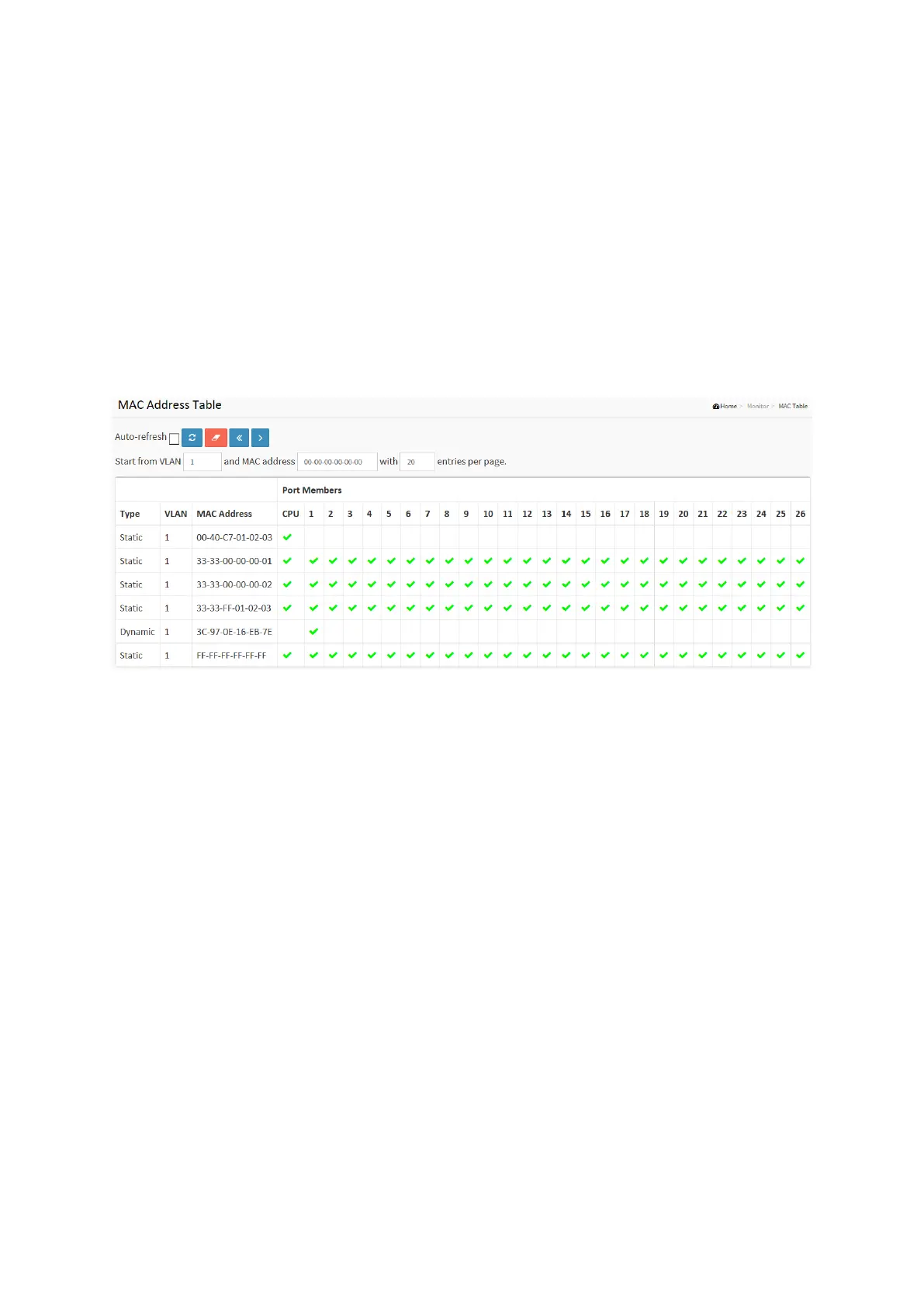 point in the MAC Table. Clicking the “Refresh” button will update the displayed table starting