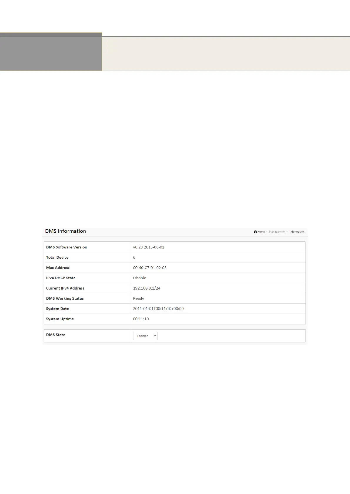 DMS software version, the maximum number of device can manage, MAC Address and IP