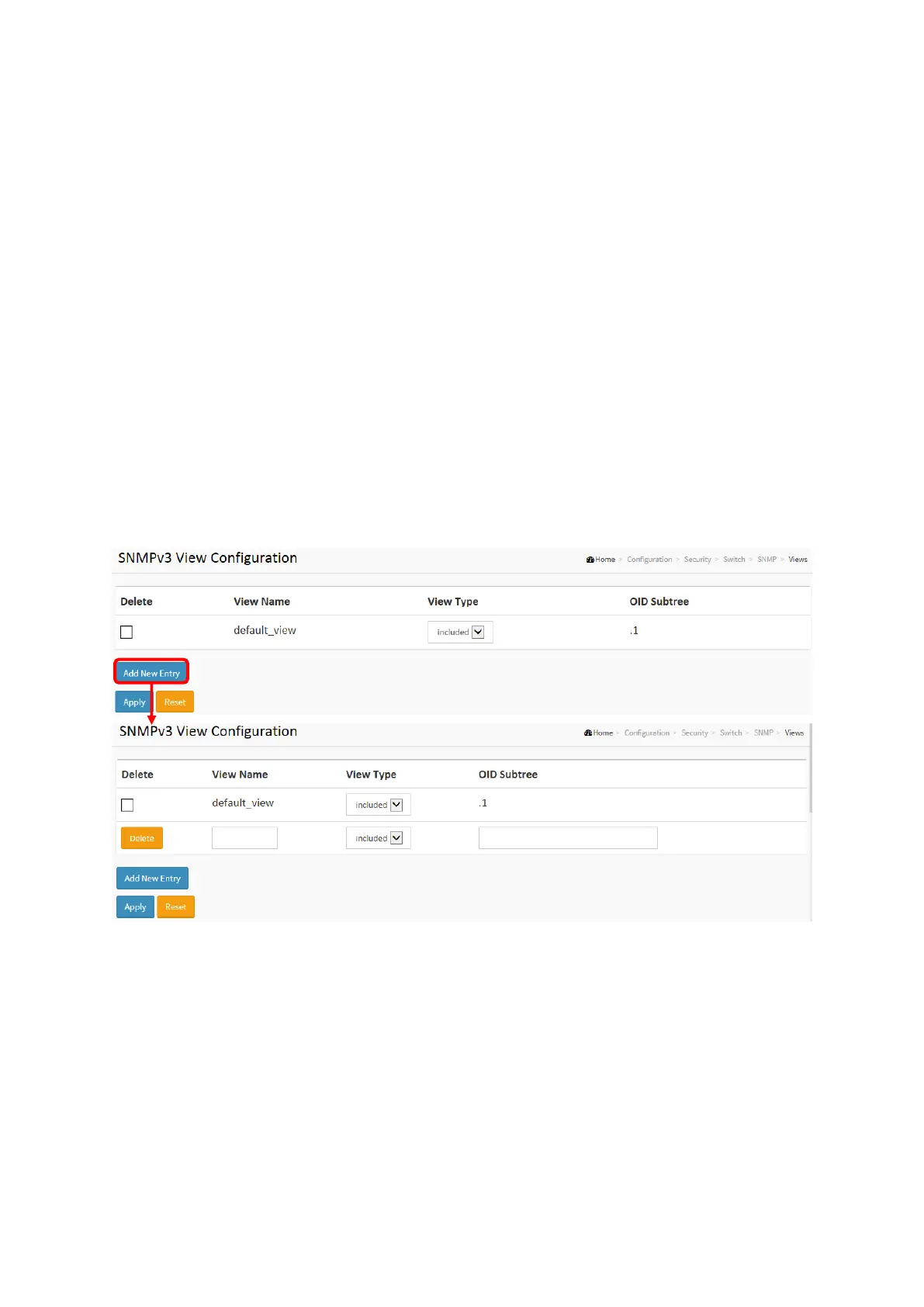 Configure SNMPv3 view table on this page. The entry index keys are View Name and OID