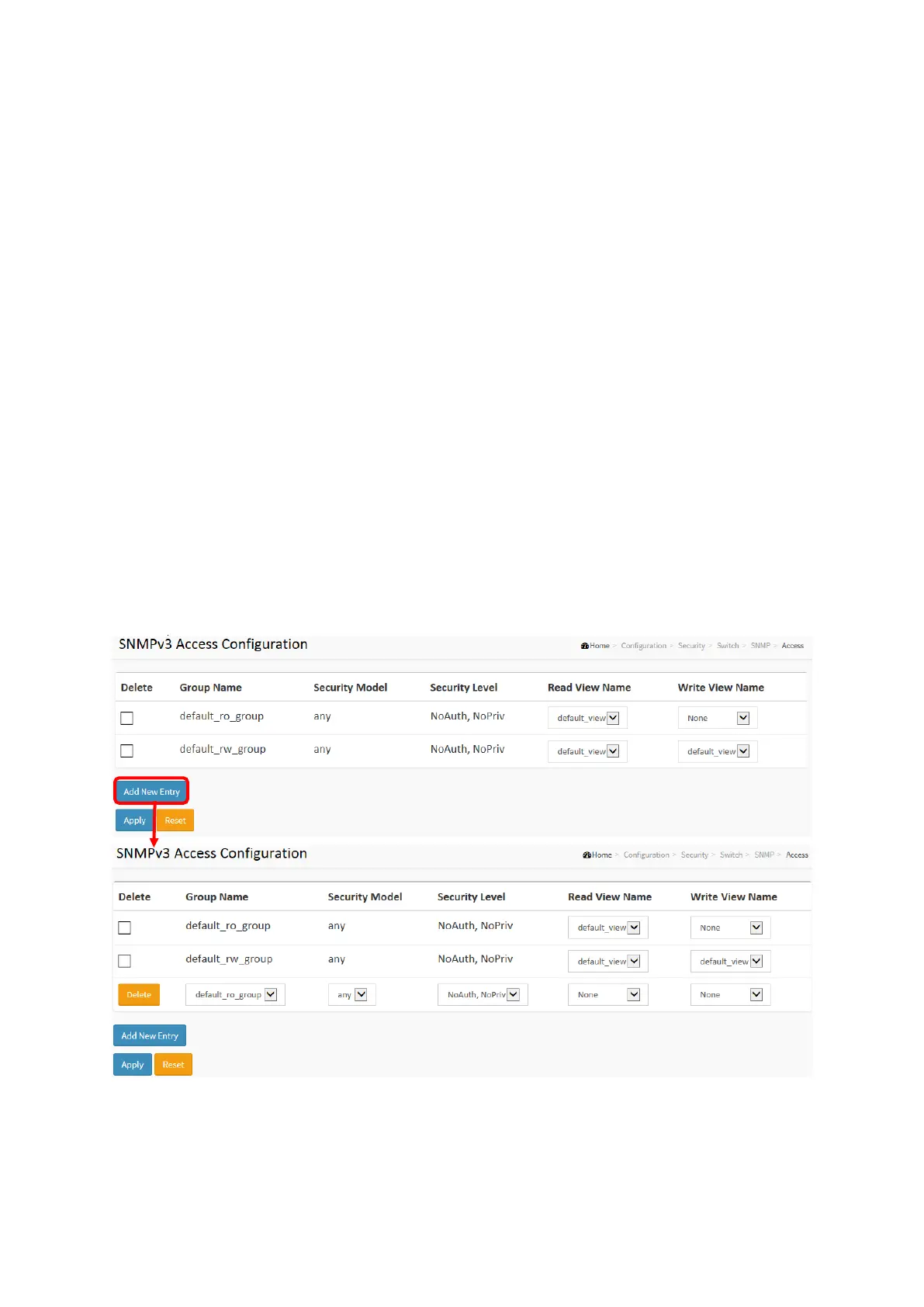 The function is used to configure SNMPv3 accesses. The Entry index key are Group Name,