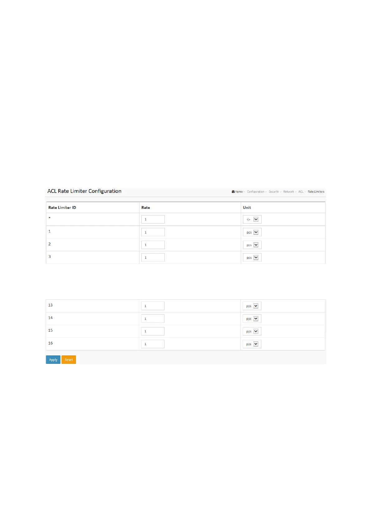 Limiter Level from 1 to 16 that allow user to set rate limiter value and units with pps or kbps.