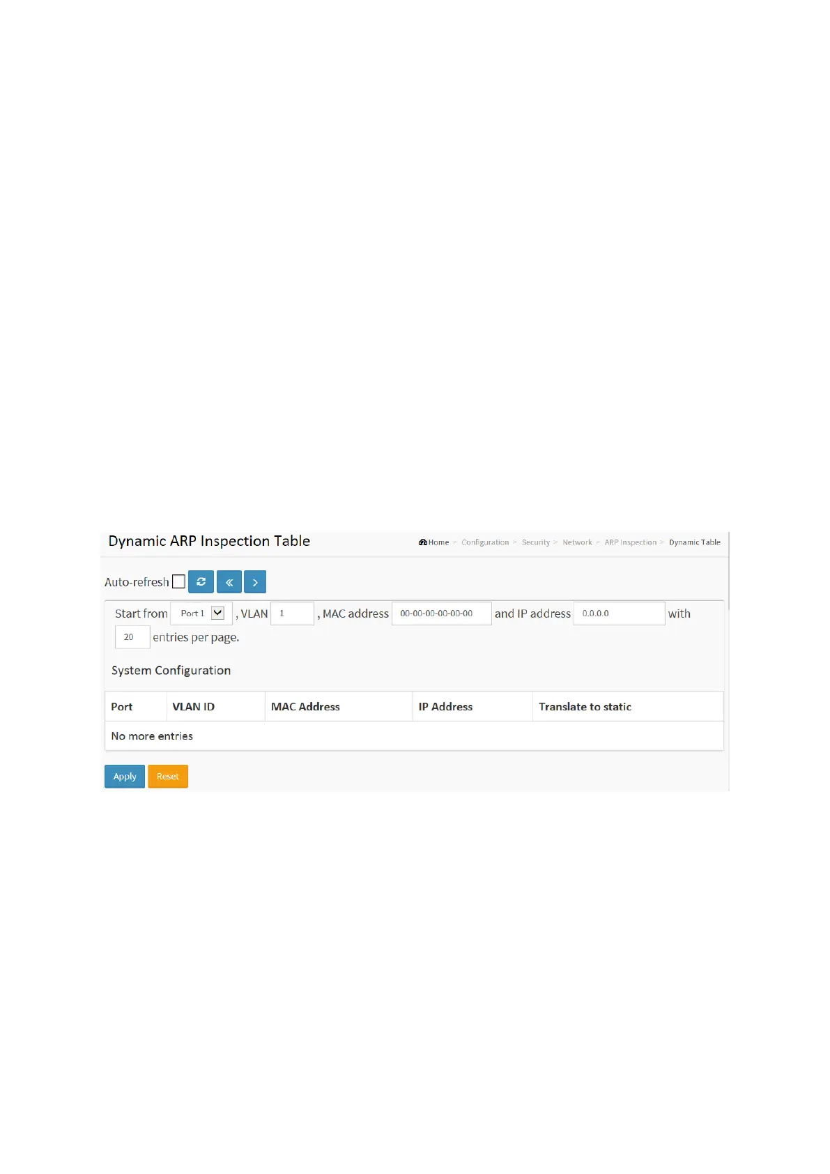 Entries in the Dynamic ARP Inspection Table are shown on this page. The Dynamic ARP