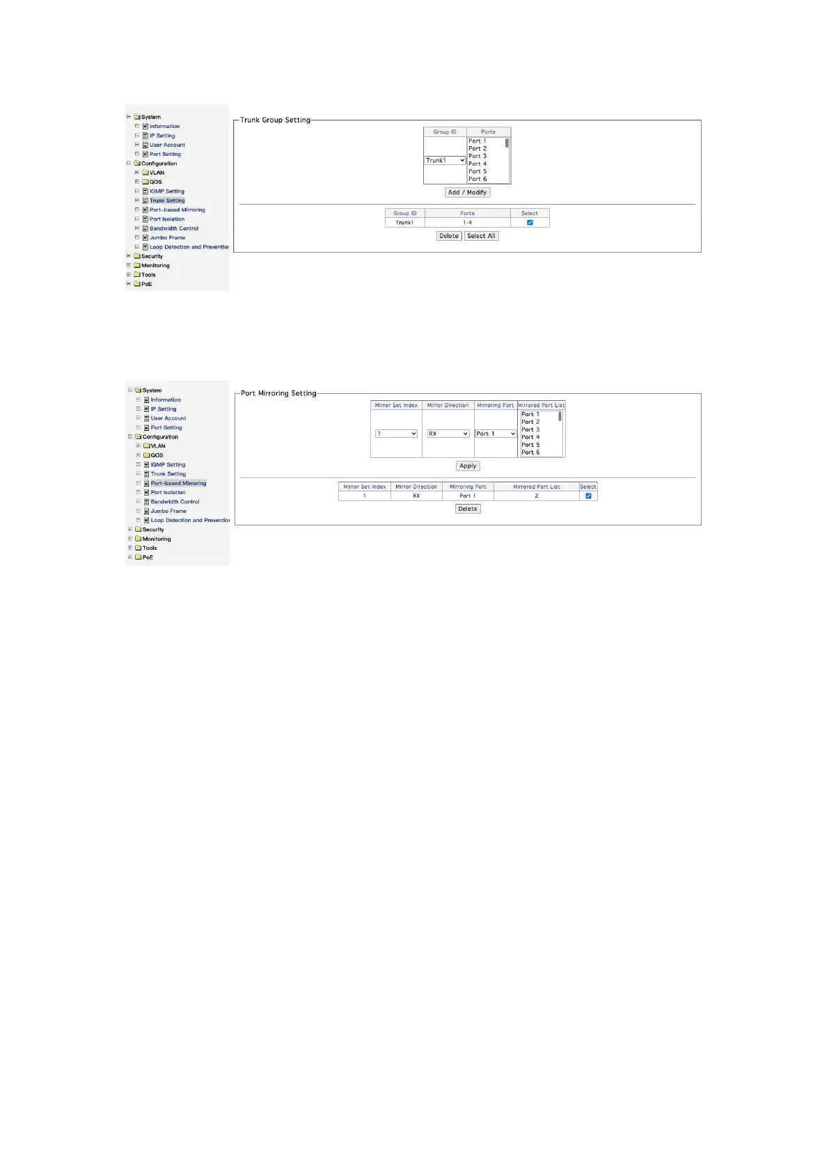 to the mirrored port. Up to 4 sets of port mirroring can be set"