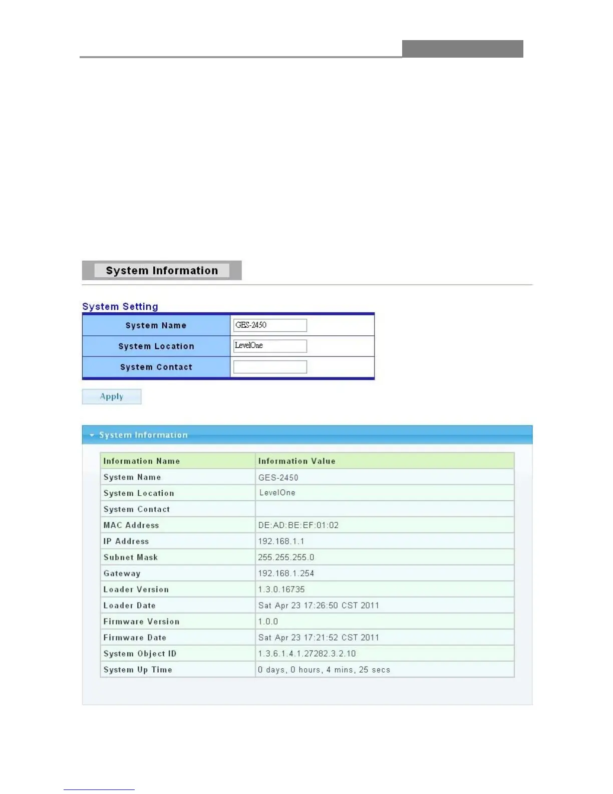 This page allow user to configure and browse some system information such as MAC address, IP