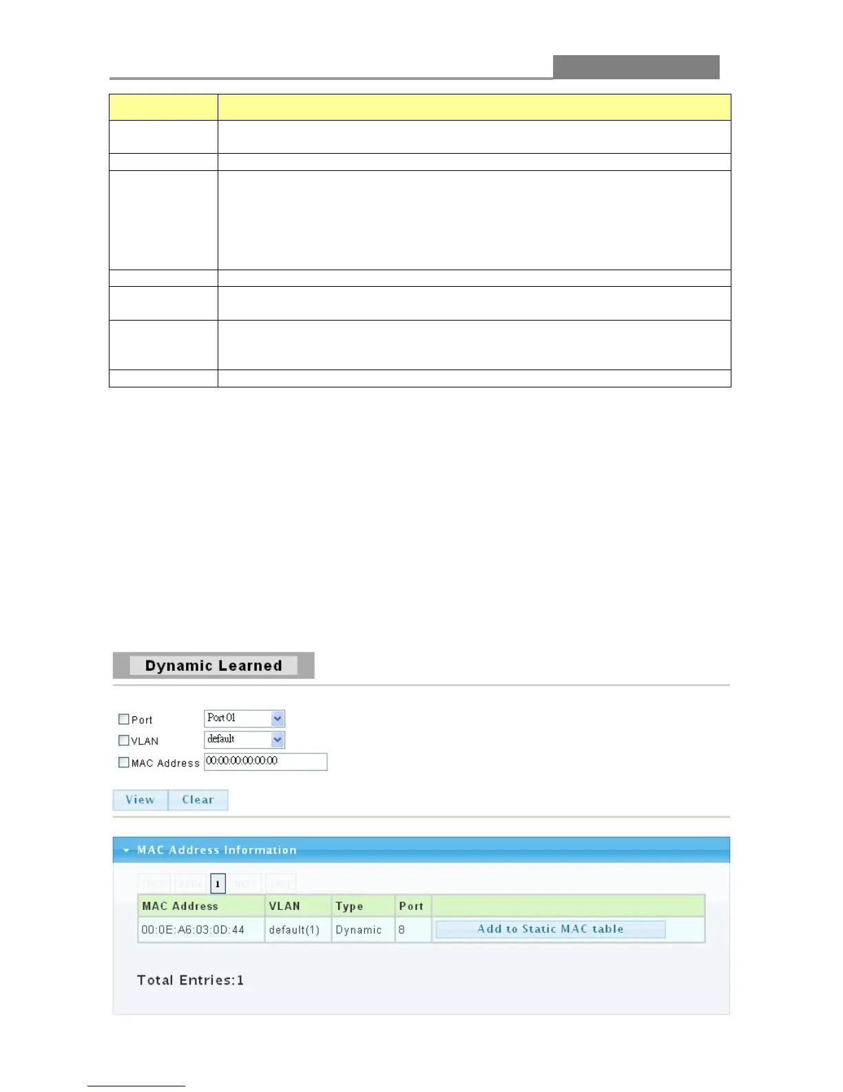Use the MAC Address Table pages to show dynamic MAC table and configure settings for static