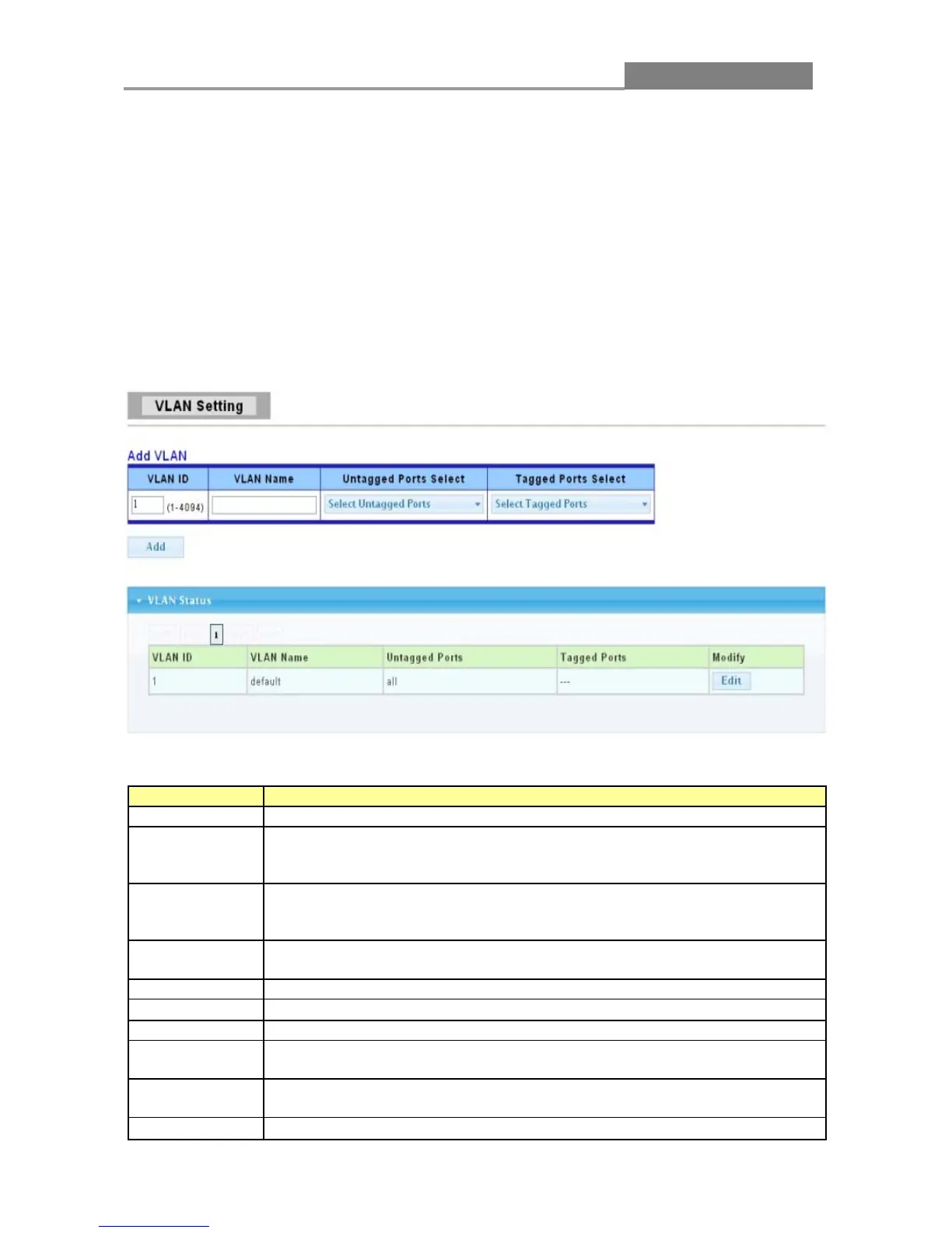 Click Switching > VLAN > VLAN Setting to access this screen below to configure and view VLAN