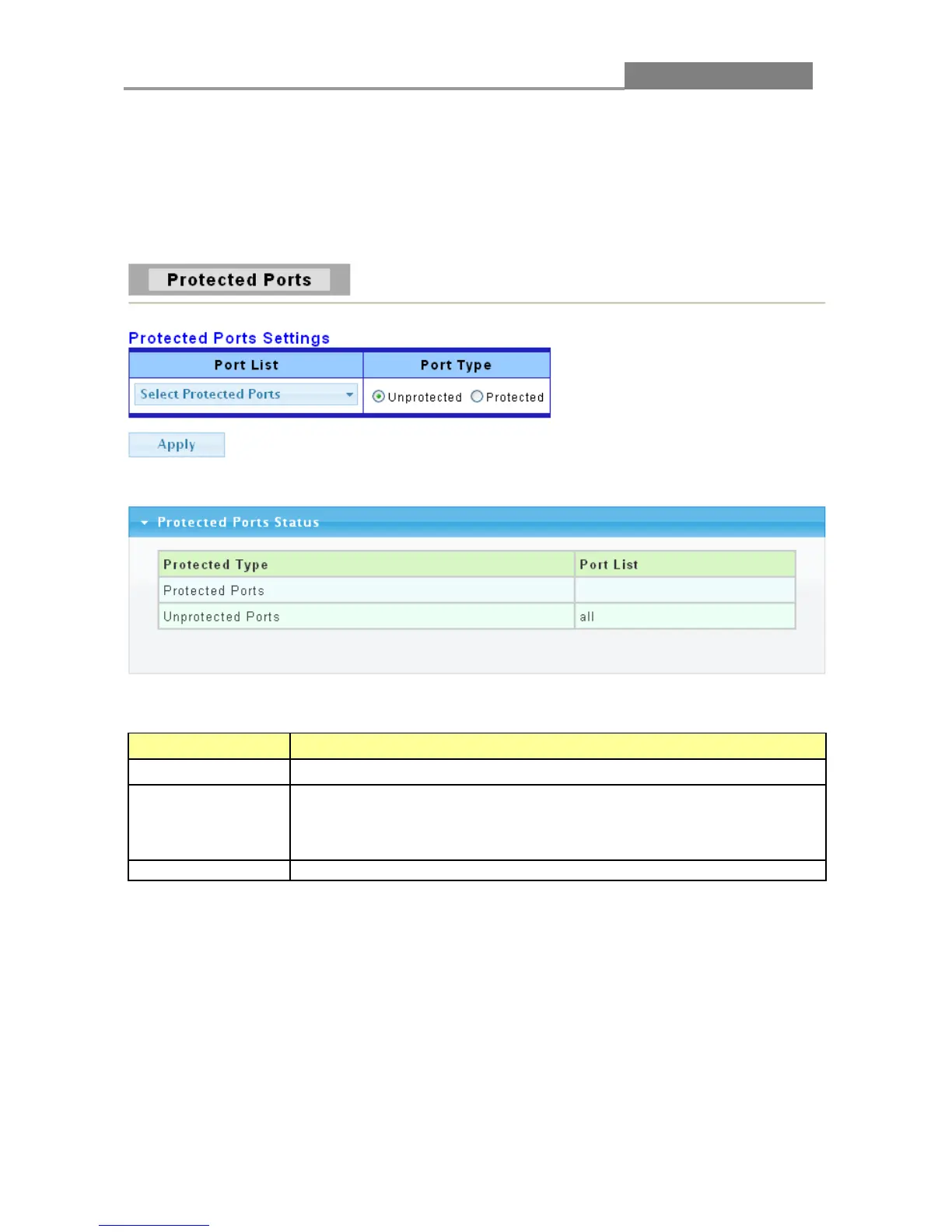 This page allow user to configure protected port setting to prevent the selected ports from